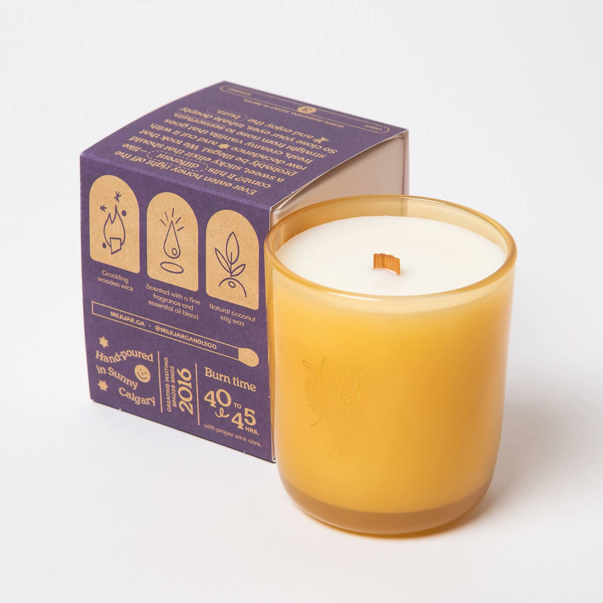 Coconut soy wax candle with approximately 40-45 hours of burn time with proper wick trimming (trim to 2-3 mm before each burn, or whenever it starts to look a little charred at the top). Hand-poured in sunny Calgary and scented with high quality, phthalate free fragrance oils. Cracking wooden wick and vegan and cruelty-free. $1 from every candle sold supports the creation of inclusive and inviting spaces around the world. When first burning your candle, keep it lit for at least 1 hour and allow the burn pool to reach the edge of the glass. Do not leave the candle burning unattended.
