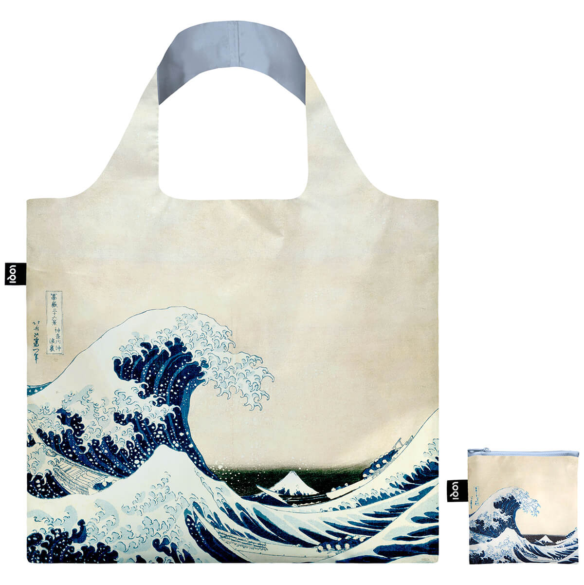 Katsushika Hokusai The Great Wave recycled shopping bag by Loqi. A handy reusable shopping tote that can carry up to 20kg of shopping but weighs just 56g and folds into its own coordinating tiny square pouch measuring just 11.5cm square. Made from recycled taffeta. Loqi is a sustainable brand and certified carbon neutral.