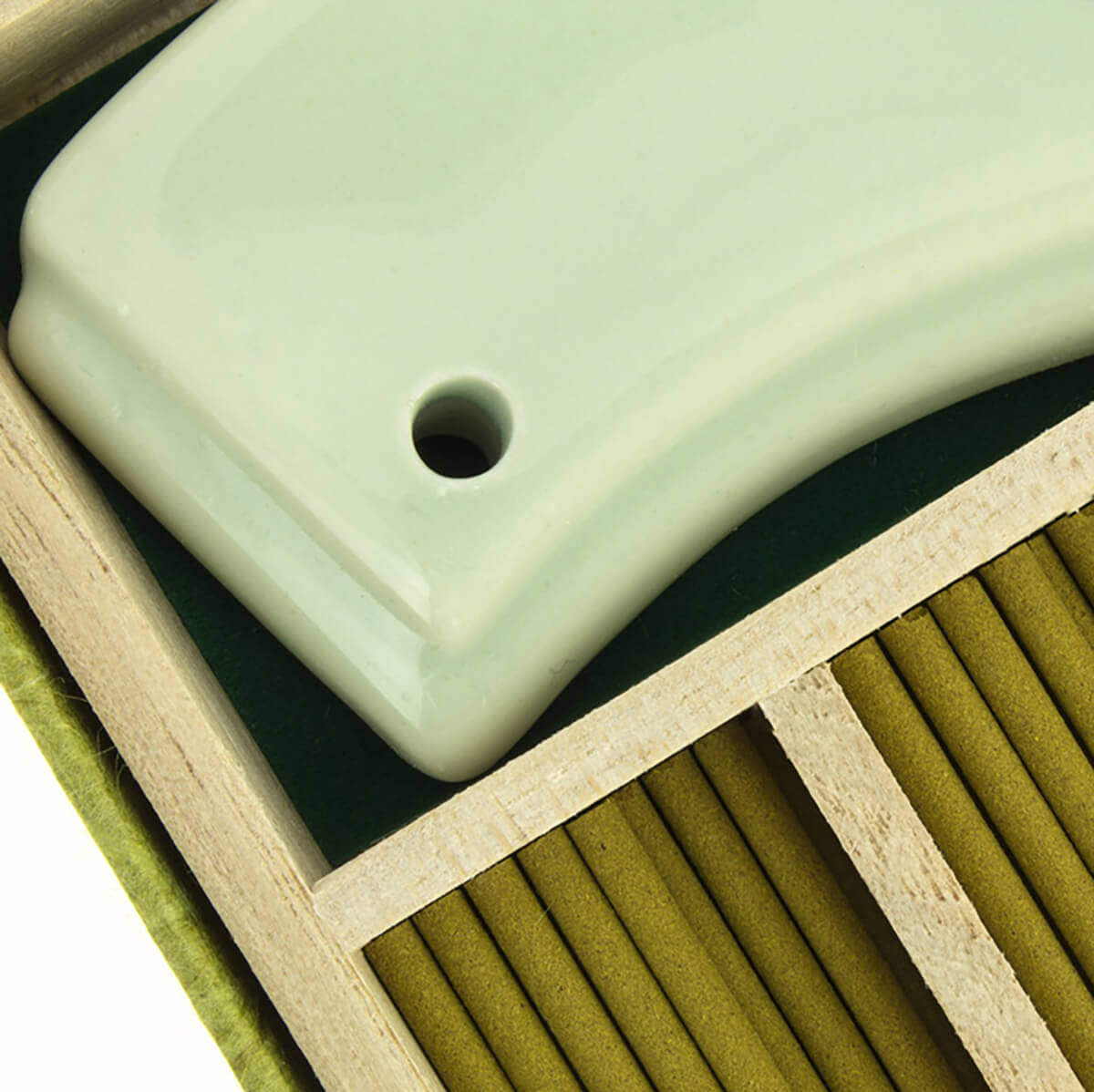 Packaged in a beautiful fabric covered paulownia wooden box, this premium incense is completed with a traditional ceramic incense stand. Each incense stick burns cleanly for about 13 minutes. Traditional Japanese incense is a low smoke, solid stick made without a bamboo core and infused with essential oils for a pure, clean fragrance and a soothing experience.