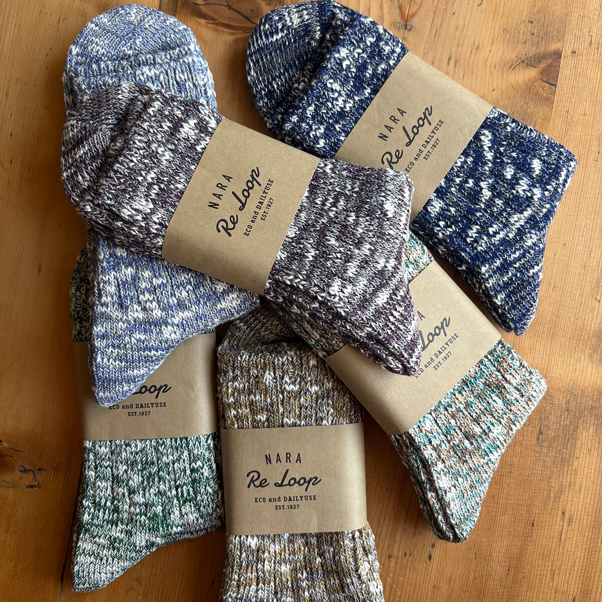 Nara Re Loop Socks by Souki. These socks have a gentle, luxurious feel, and the simplicity of the design makes them extremely wearable both in in day-to-day life and for a day out in nature. Based in Kōryō-chō, Nara Prefecture, Souki use low gauge knitting machines, continuing the tradition of the area since 1927. Re Loop is named for the intent to pass down the sock making techniques to future generations.