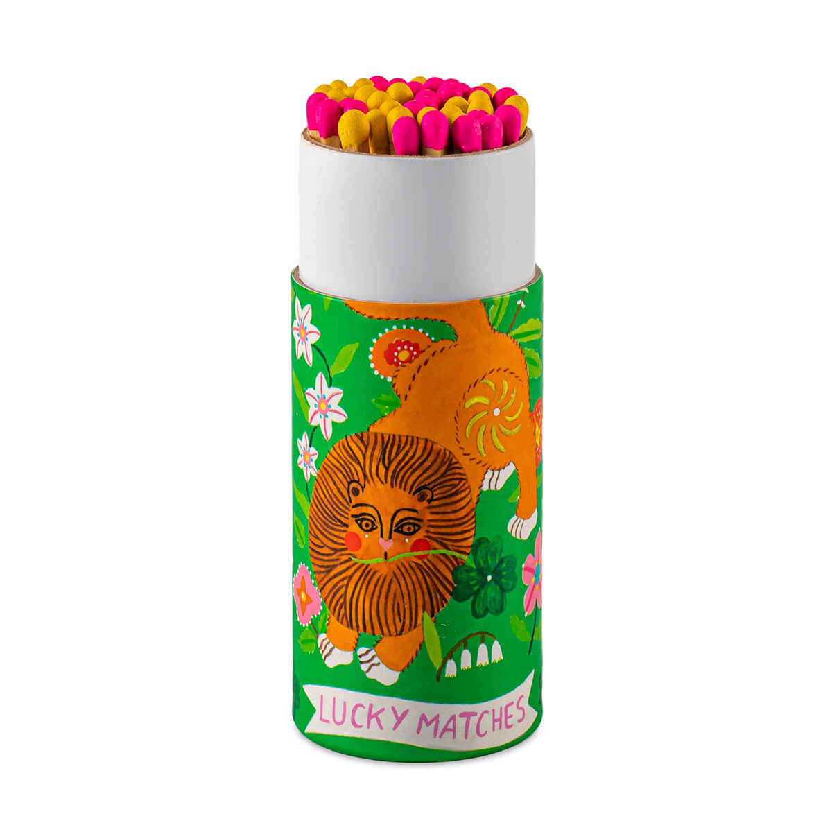 Small Cylinder Matches by Archivist Gallery. Archivist Gallery's small cylinder matches with a bright green background featuring an orange tiger playing among the flowers. Playful and nostalgic, these little cylinders hold 45 matchsticks, ready to spark a little joy. Simply pop off the lid, pull out a match, and strike!