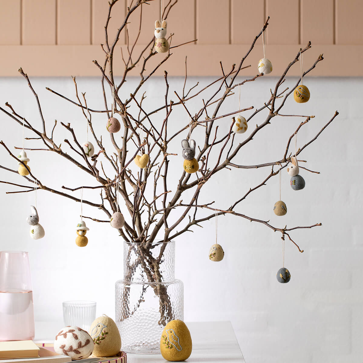 Eggs with Embroidery Heather Hanging Decorations by Gry & Sif. Set of three eggs with embroidered heather flower. Beautiful soft felted Easter decorations. Handmade and truly unique. Suitable for all your Easter festivities.