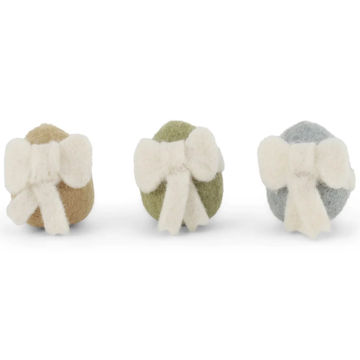Colourful Eggs With Bow Hanging Decoration by Gry & Sif. Set of 3 sweet hanging decorations with string. Beautiful soft felted Easter decorations. Handmade and truly unique. Suitable for all your Easter festivities.