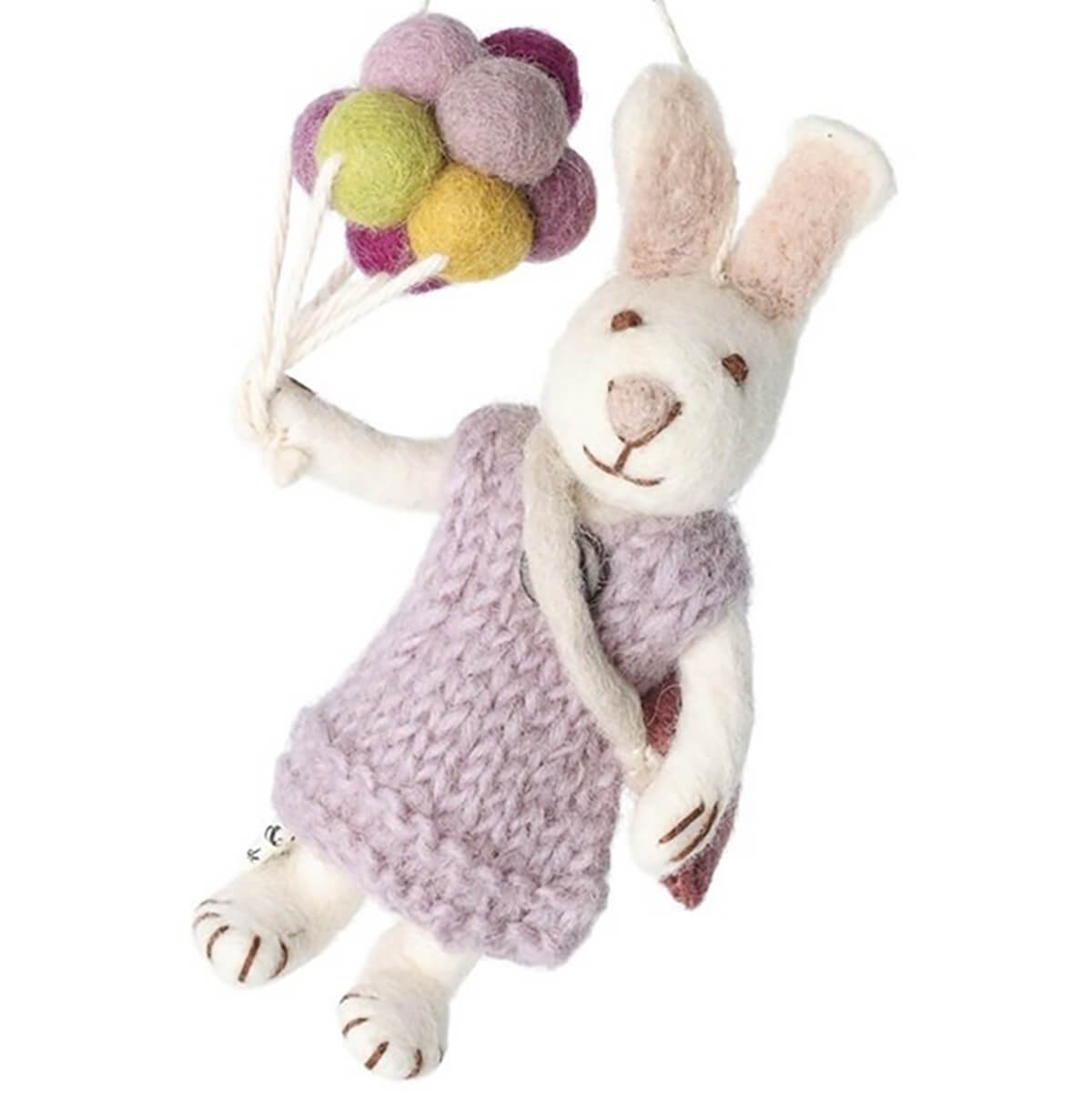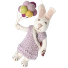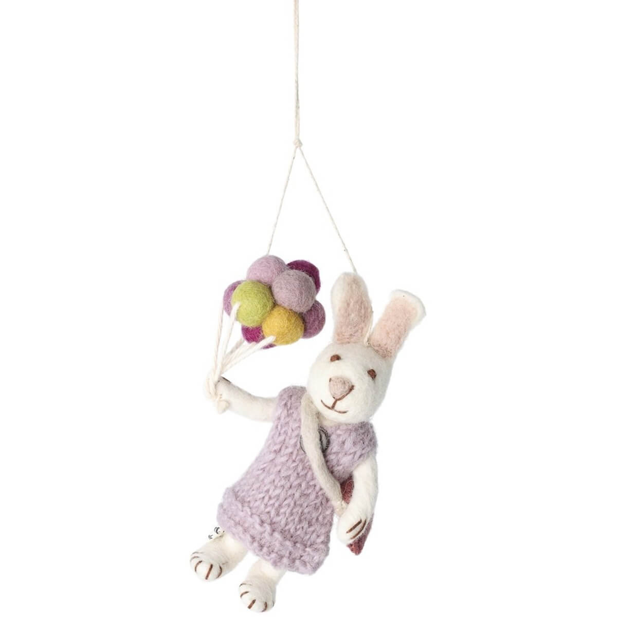 White Bunny Hanging Decoration by Gry & Sif. Sweet hanging bunny decoration with string. The bunny is wearing a lavender coloured knitted dress and is holding a bunch of balloons. A beautiful soft felted Easter decoration. Handmade and truly unique. Suitable for all your Easter festivities.