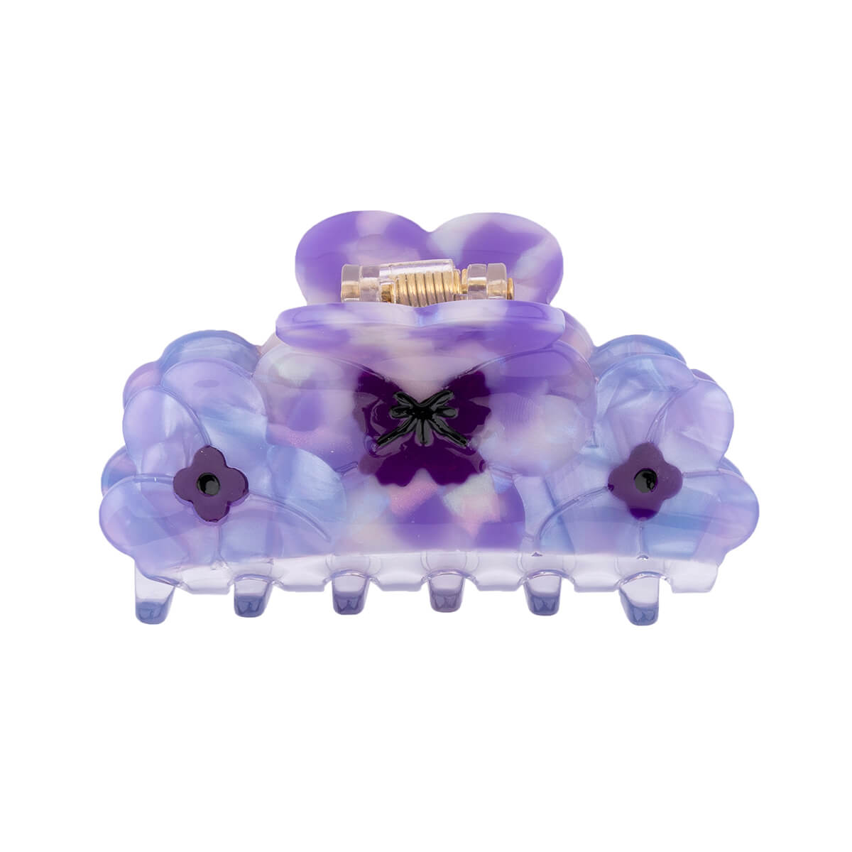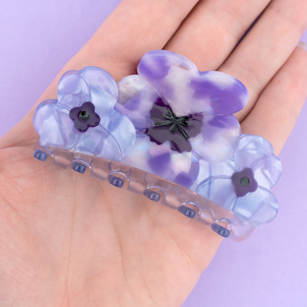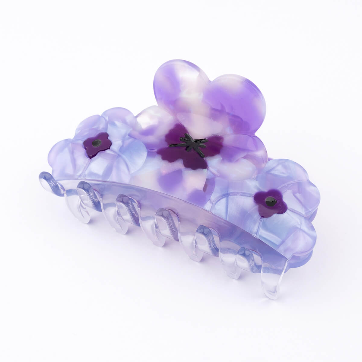 Three Pansies hair claw by Coucou Suzette. A big floral full acetate hair claw with three beautiful mauve pearly pansies to make you bun amazing. Made from plant-based eco-friendly cellulose acetate.