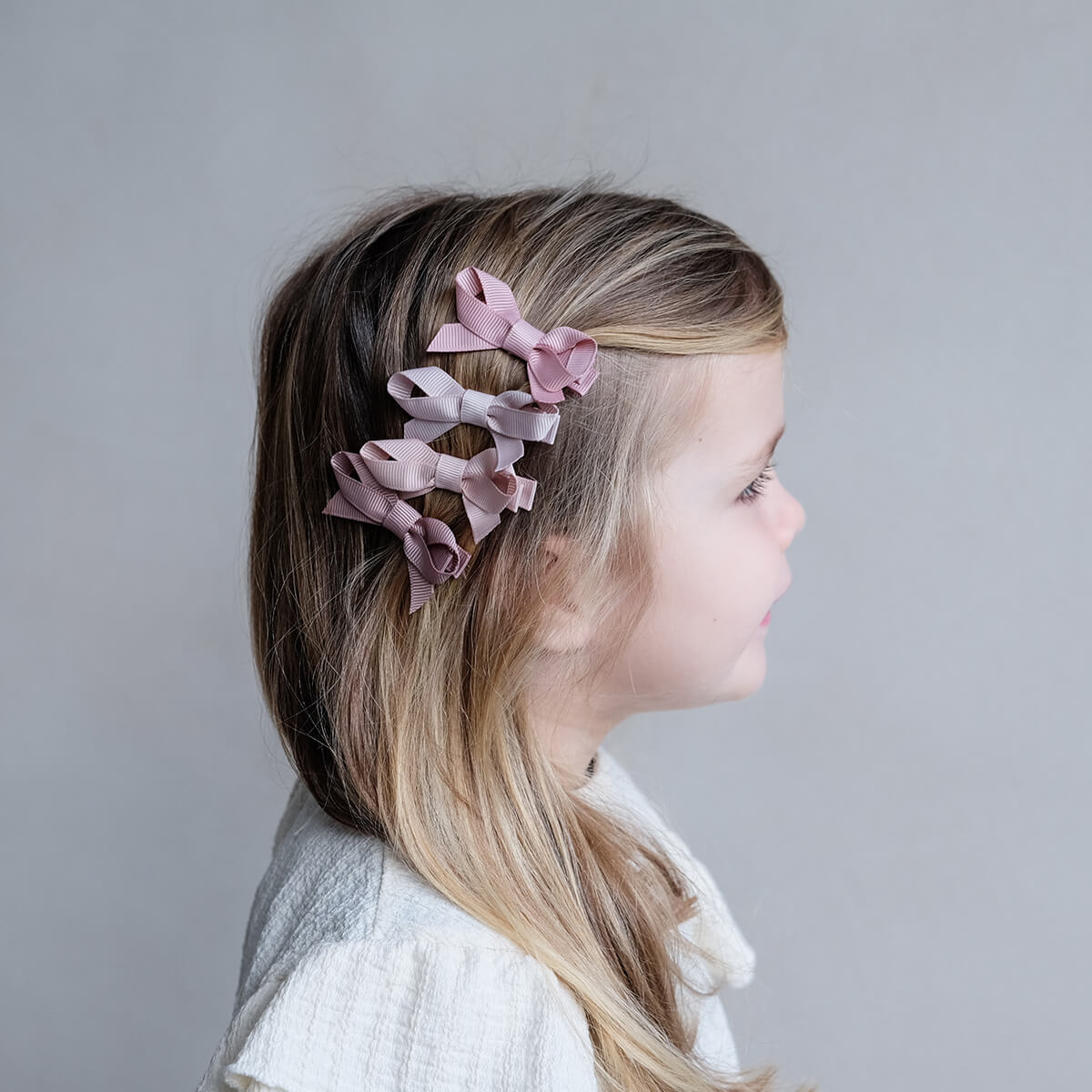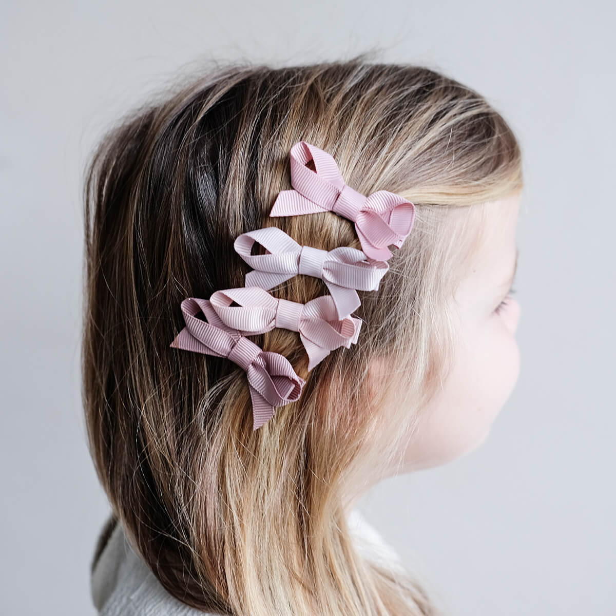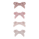 Bonnie Bow Hair Clips by Mimi & Lula. Four beautiful bows in a pretty palette of dusky pinks and neutrals. These delicate little ribbon bows are carefully hand tied and secured to alligator clips, sure to stay in place in even the finest hair. Features grosgrain ribbon hand tied bows.