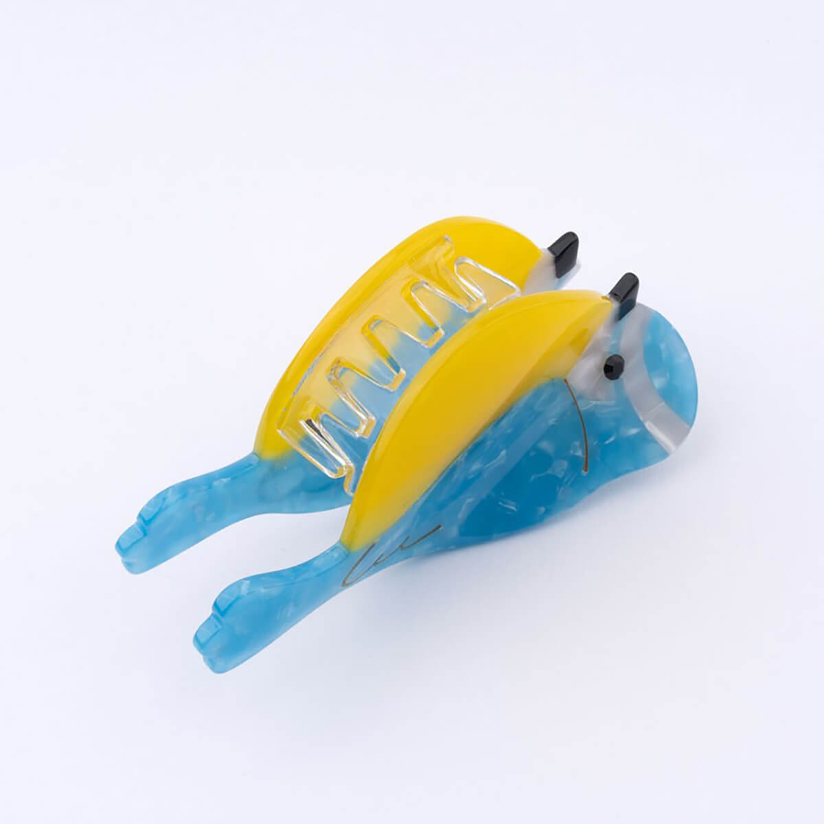Chickadee hair claw by Coucou Suzette. Full acetate hair claw shaped as the sweetest blue tit. An original hair clip in dazzling bright yellow and turquoise blue with golden details. This bird's small round belly will find its place perfectly in your hair. Made from plant-based eco-friendly cellulose acetate.