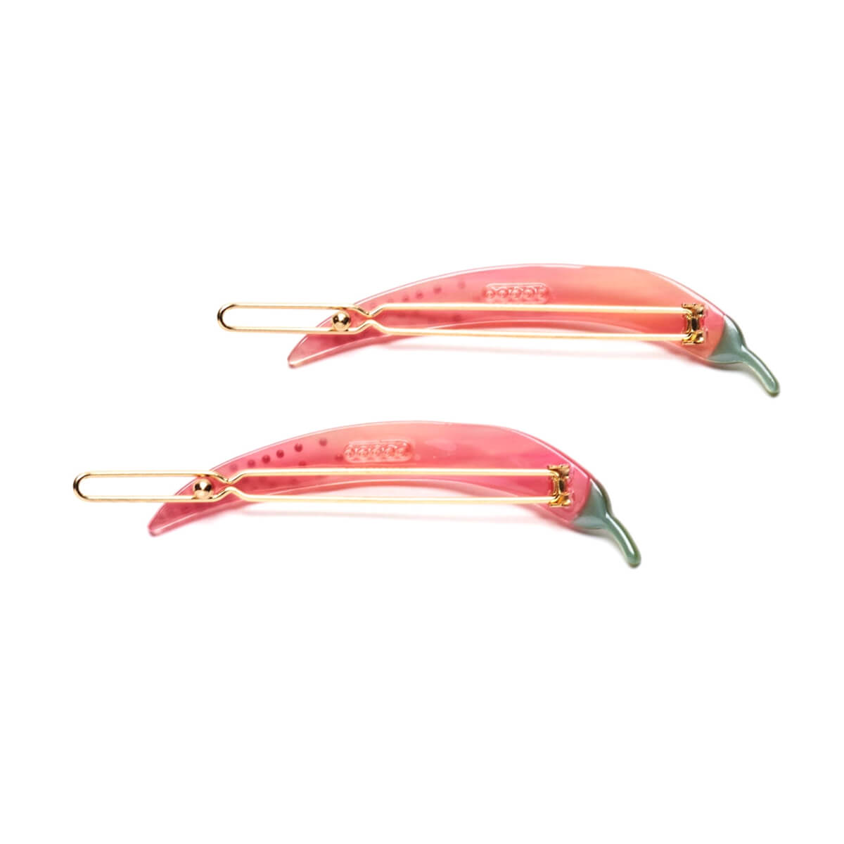 Chili Pepper Barette Clips by Winona Irene. The cutest set of Thai Chili Pepper barrettes that look just like the real thing! Featuring a frosted swirling orangey-red acetate, and just a dash sparkling crystals.