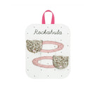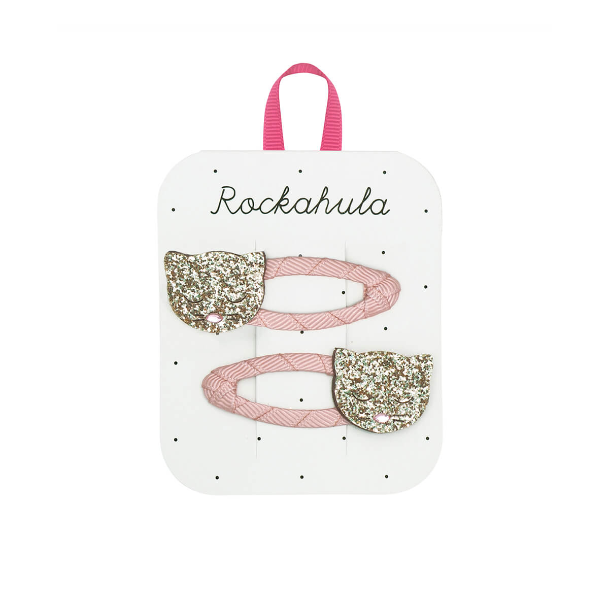 Clara cat hair clips by Rockahula Kids. These sweet clips are the purrr-fect way to add a little shimmer to your day! Featuring Clara Cat, with her glittery ears and gem nose, each clip is wrapped in soft dusky pink grosgrain ribbon.
