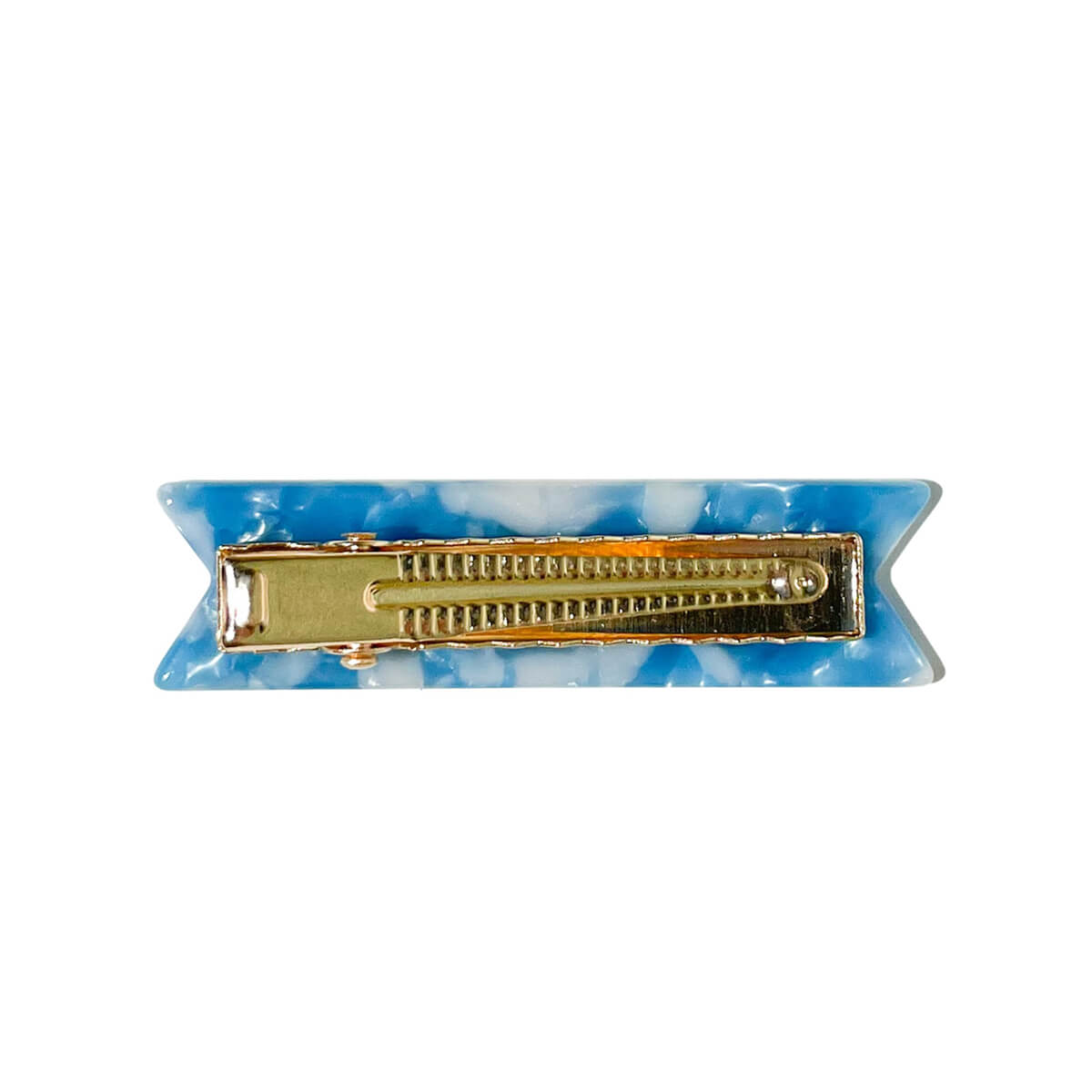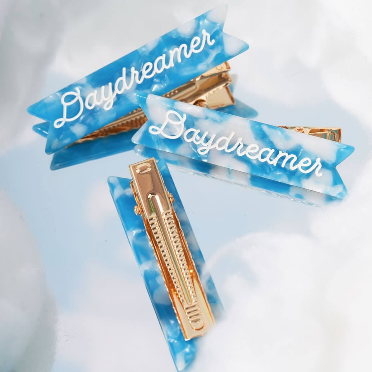 Blue and white cloud acetate with white cursive ink inlay and gold mini alligator clip on back