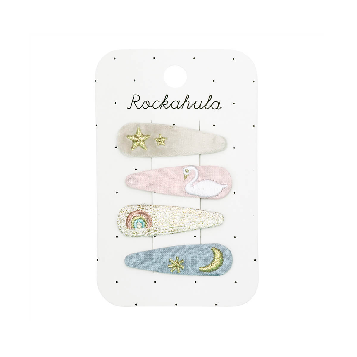 Enchanted embroidered hair clips by Rockahula Kids. This four pack of embroidered clips are beautifully detailed with swans, rainbows and starry moonlit skies. Each clip is encased in either soft fabric or velvet, and is backed with felt to give a soft feel for little heads.