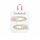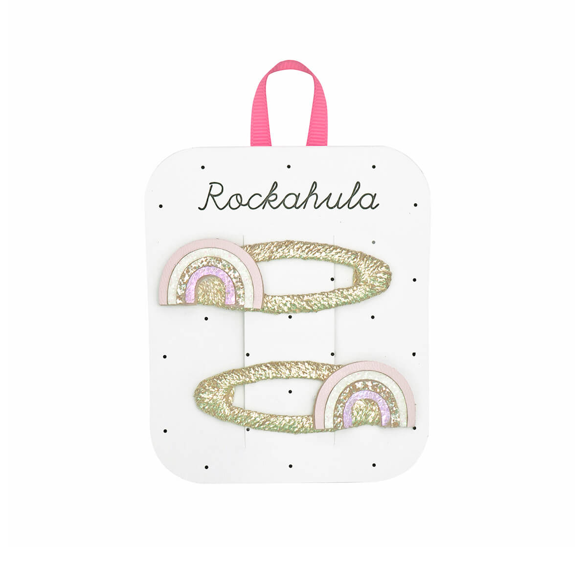 Enchanted rainbow hair clips by Rockahula Kids. Fall under a magical spell and discover a world of enchantment with these shimmering rainbow clip set. Made from the softest colour palette with a hint of sparkling gold and set onto gold wrapped snap clips./p>