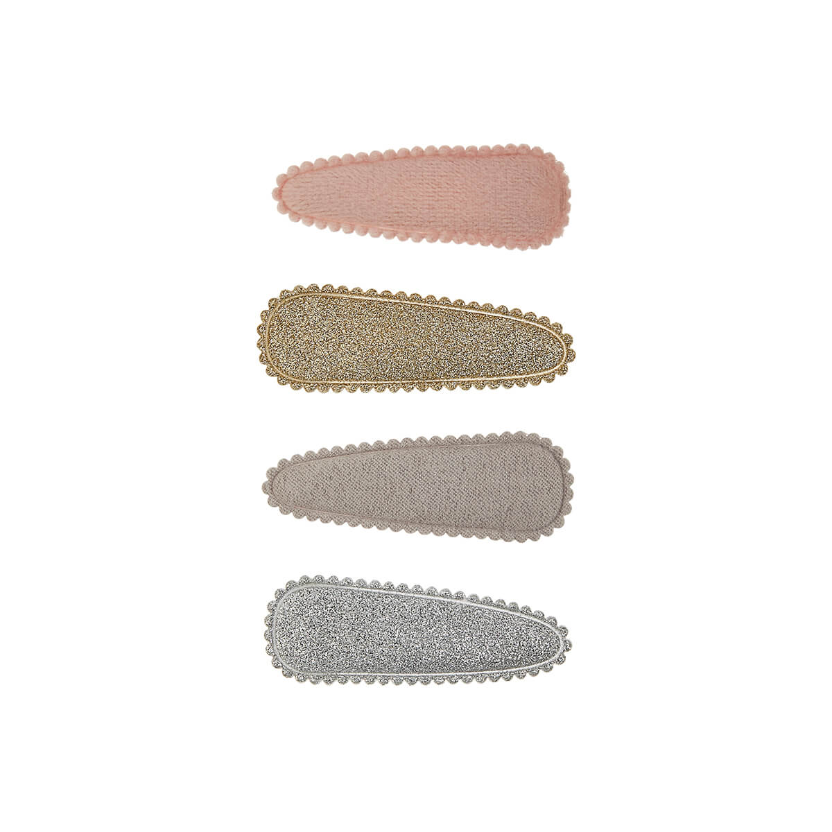 Fairy Sparkle Mabel hair clips by Mimi & Lula. Beautifully simple, this classic clic-clac shape is re-imagined in a soft and pretty palette and includes 4 different clips in soft pink velvet, pale grey suedette and silver and gold glitter. Easy and quick to clip in and out of the hair of even the fussiest child and yet secure at the same time. We've tried and tested these and can assure you that they withstand parties, playgrounds and school! Wear them individually or a few together, a great everyday essential.