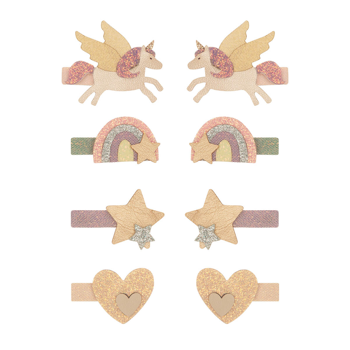 Flying Unicorn Mini Clips by Mimi & Lula. Let their mythical dreams take flight with this super magical mini clip set featuring sparkling unicorns, twinkling rainbows, shimmering stars and golden hearts.