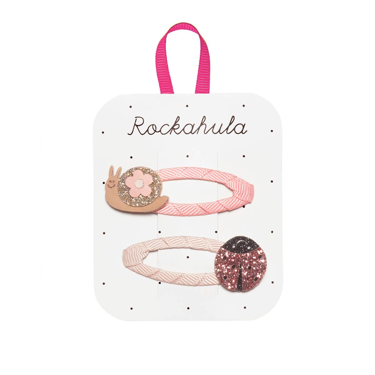 Garden Friends Hair Clips by Rockahula. Lovely Lola ladybird has found her best friend Sid the Snail and they're ready for some fun in the sun. Wear them both to explore the garden and see if you can find extra garden friends. Each sat upon a grosgrain ribbon wrapped snap clip.