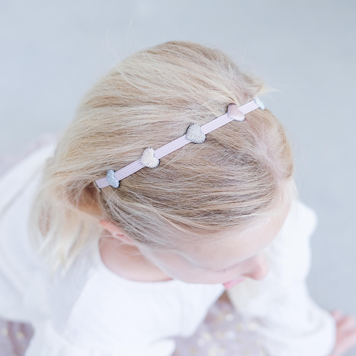 Super soft pink elastic adorned with 7 padded glitter and metallic fabric hearts.