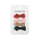 Jolly Christmas Mini Bow Clips by Rockahula. In a palette of fun and bright colours, these four little hand-tied fabric bows each adorn a salon bar clip, with each clip wrapped in soft grosgrain ribbon. Wear them one at a time, or all together!
