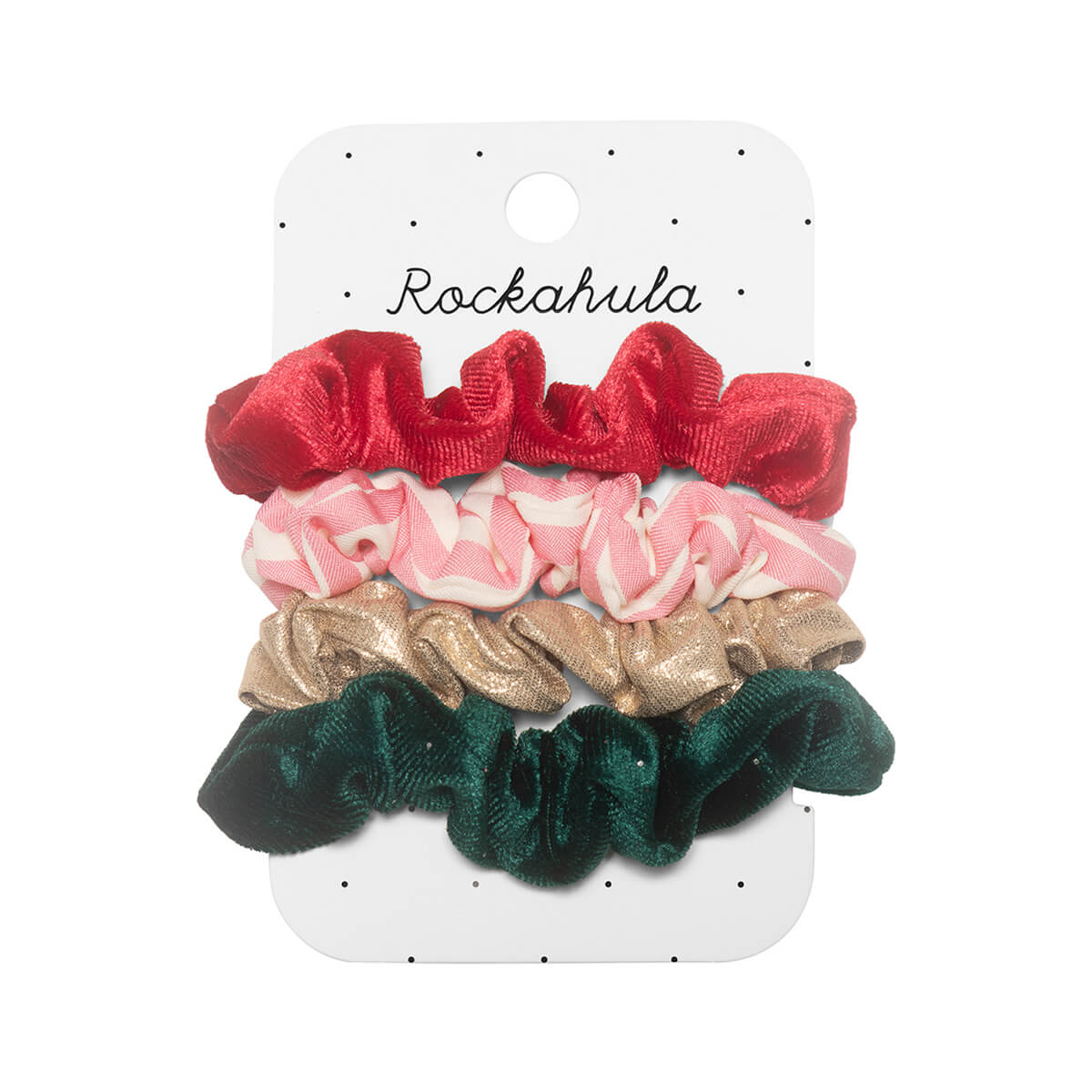 Jolly Christmas Scrunchie Set by Rockahula. A pack of four sweet and festive scrunchies, each in a different beautiful fabric. Featuring super soft velvet fabric in emerald green and deep red, a shimmering gold and a pink and white striped fabric.