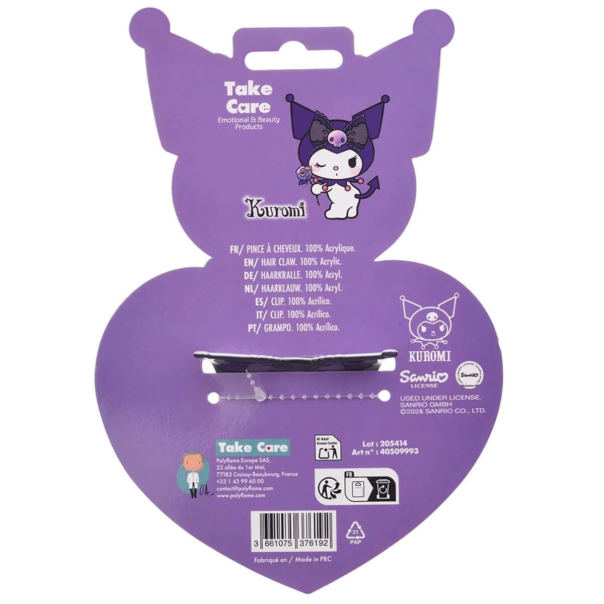 Kuromi Hair Clip by Take Care. Add a touch of cuteness to your hairstyles with this Kuromi face-shaped hair clip. Its adorable design and practical fastening make it the perfect accessory to complete your look with charm and softness.