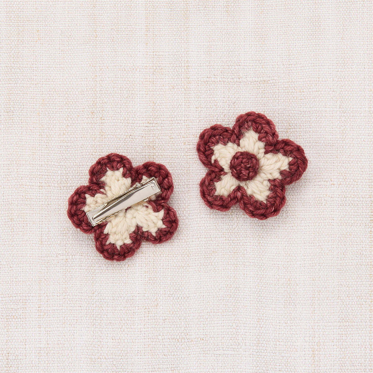 Medium Flower Clip Set by Misha & Puff. A hand-crocheted flower clip set in Merino wool, mounted on alligator clips. A little pop of embellishment for any look.