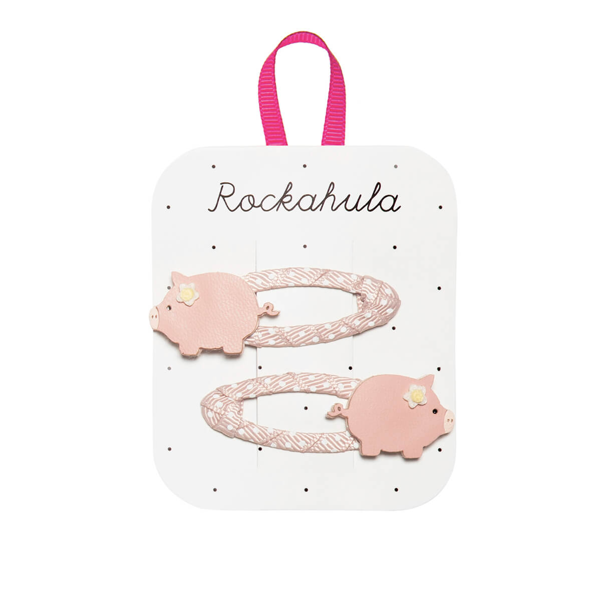 Polly Pig Hair Clips by Rockahula. The sweetest little piggies adorn these cute clips. Each pig is delicately detailed with a little flower and a cute curly tail, and is set upon a spotty pink grosgrain ribbon wrapped snap clip. Perfect for any springtime farm adventures.