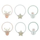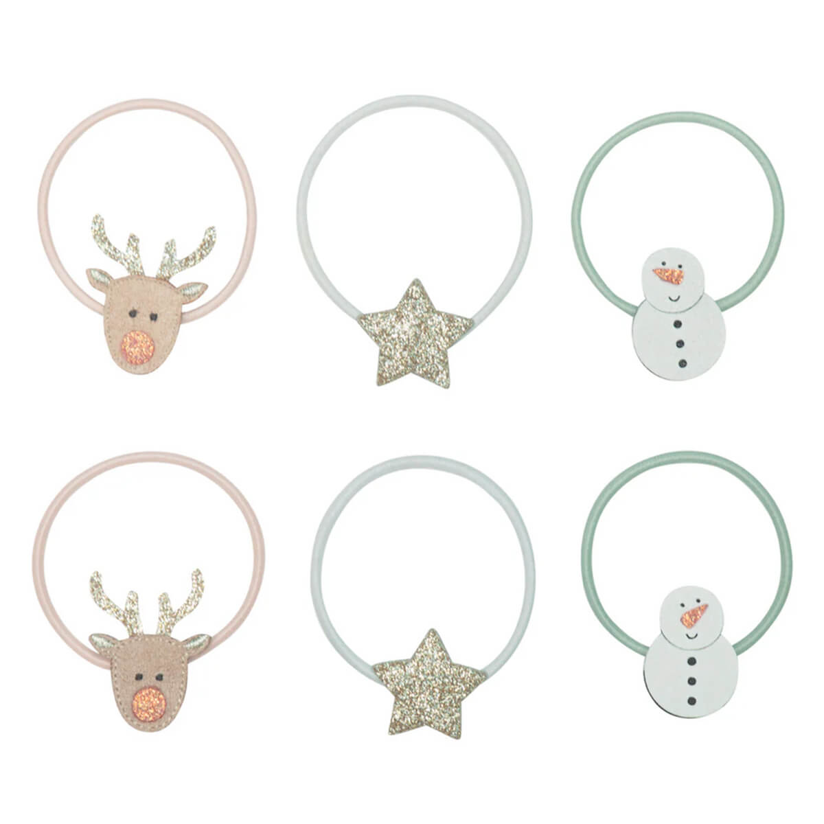 Pack of 6 5cm elastic ponies. Reindeers, stars and snowmen all hand crafted from soft suedette, glitter and metallic fabrics.
