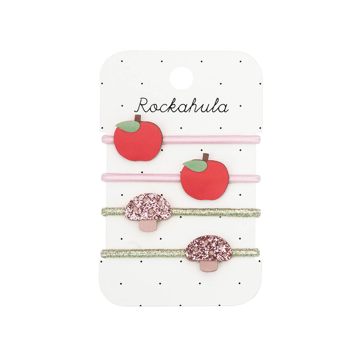 Rosy apple and toadstool ponies by Rockahula Kids. A pack of four elastics featuring two rosy red PU apples and two glittery pink toadstools set upon gold and pink elastics. Each little apple is detailed with a little stalk and green leaf.