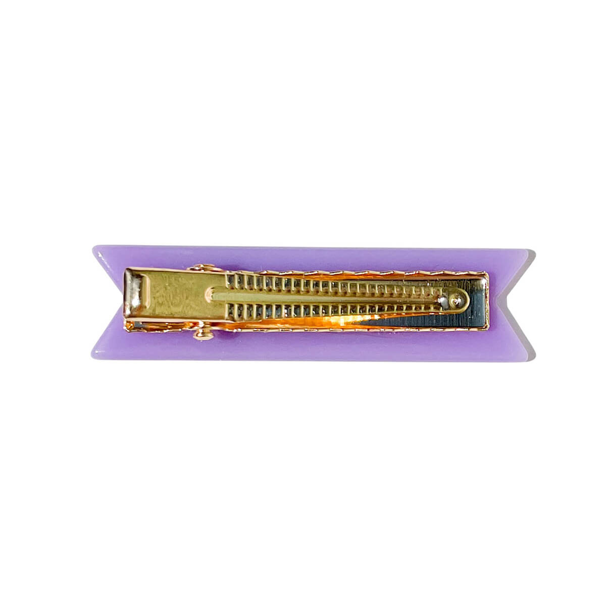 Lilac cellulose acetate with candy pink cursive ink inlay and a gold alligator clip on the back.