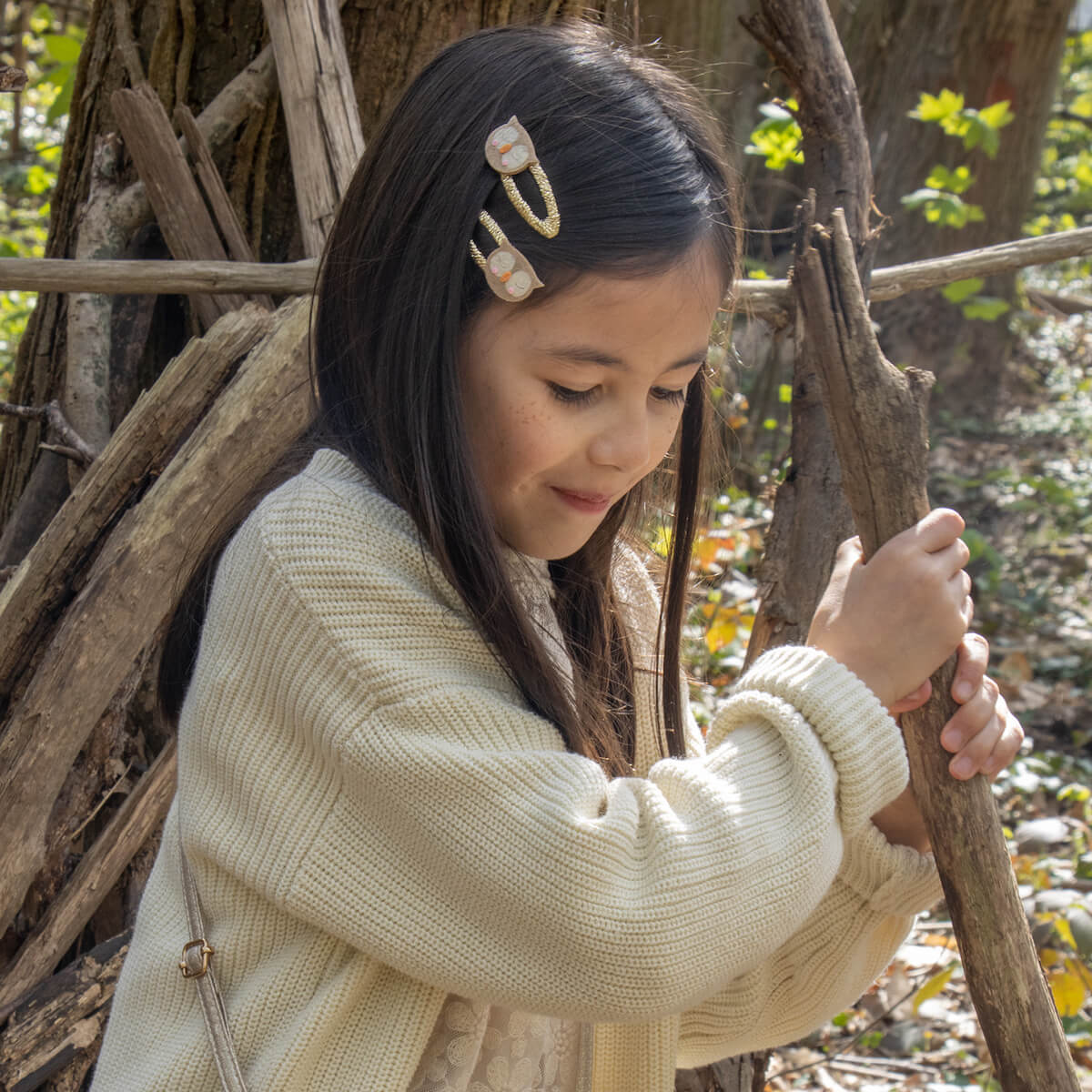 Sleepy Owl Hair Clips by Rockahula. Two sleepy little Owl's with rosy cheeks adorn gold ribbon wrapped snap clips. Twit twoo!