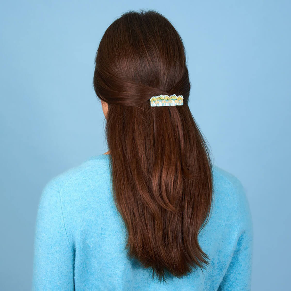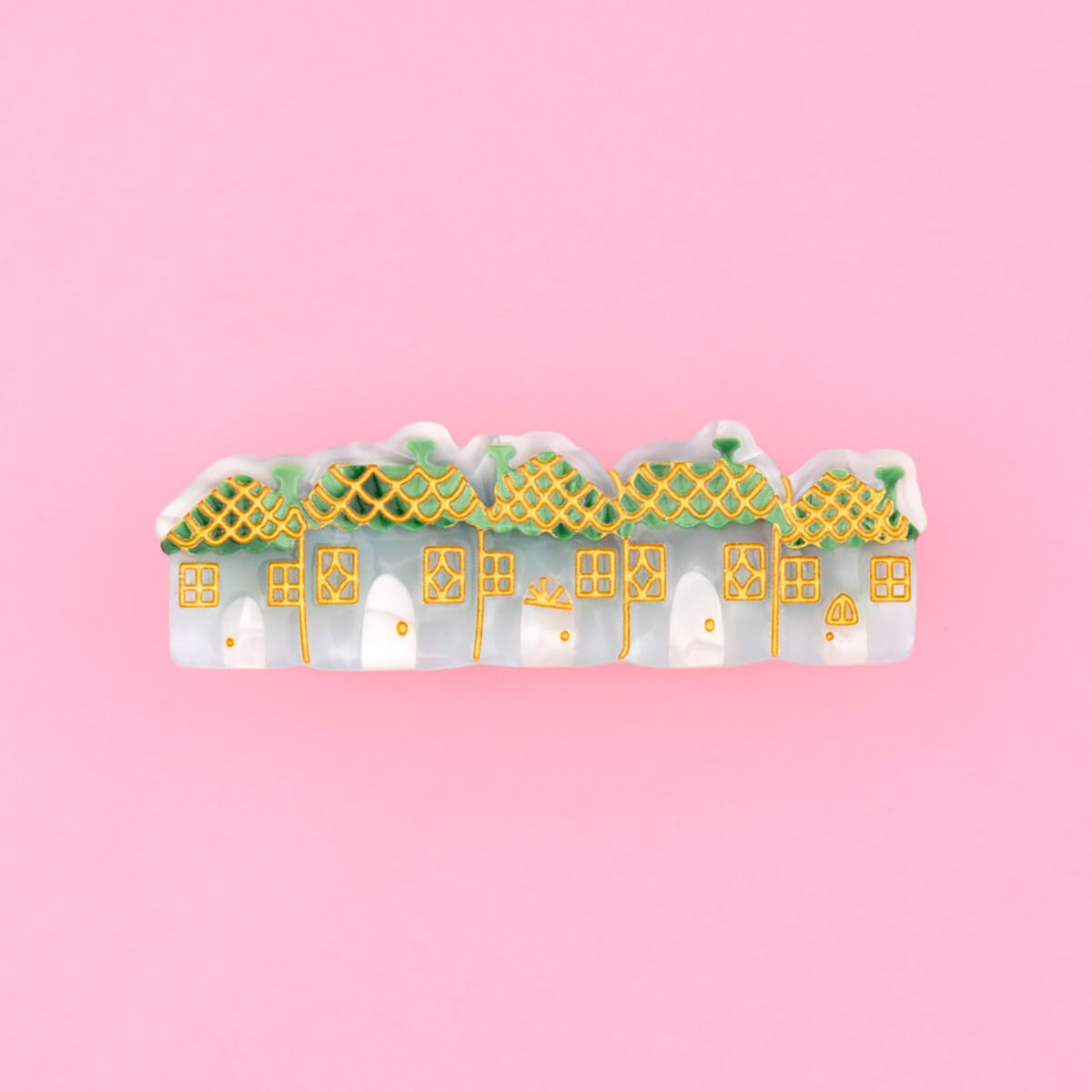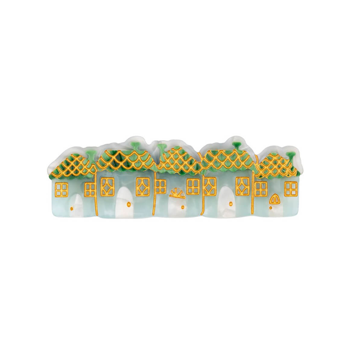 Snowy Town Hair Clip by Coucou Suzette. A cute hair barrette decorated with an adorable little village of houses under the snow, as if huddled together to protect themselves from the cold. We completely melt in front of this original and colorful accessory that brings life to our hairstyles and joyfully celebrates the Christmas spirit.