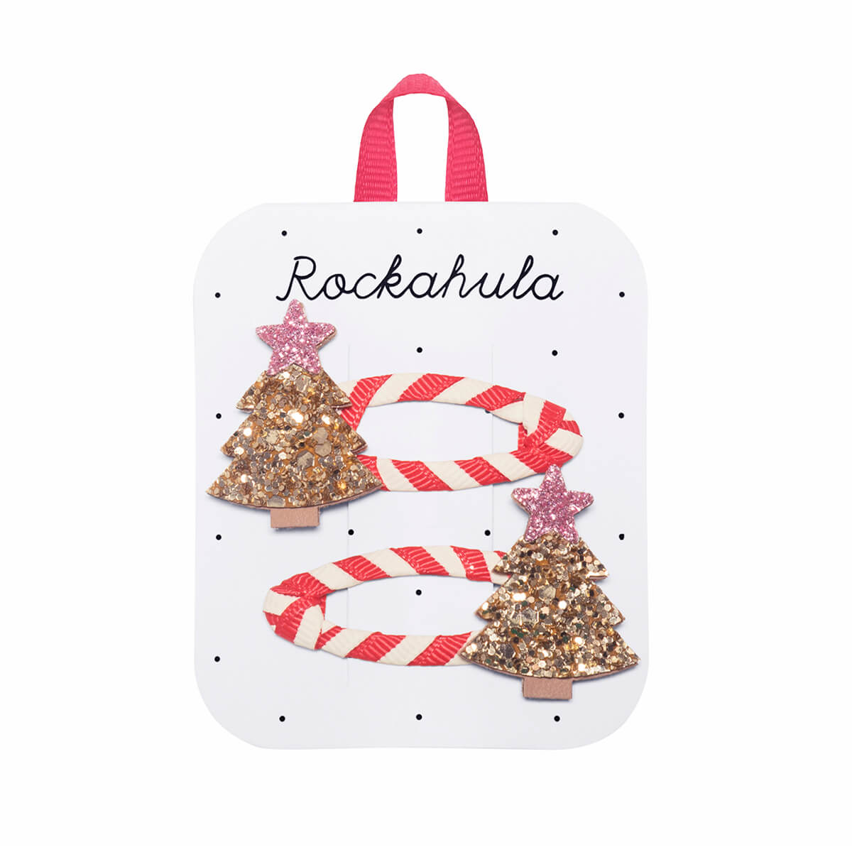 Stripy Christmas Tree Hair Clips by Rockahula. Sparkle your way through the Christmas season in these super fun Christmas tree clips! In chunky gold glitter, with pink glitter star toppers, each tree is secured to red and cream striped ribbon wrapped snap clips.