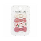Wildflower mini bow hair clips by Rockahula Kids. This set of mini bow clips is made from a palette of dusky colours and includes some sweet signature fabrics. Featuring a linen pink fabric, gingham fabric, wildflower print fabric and shimmering gold! Each base clip is covered in soft grosgrain ribbon.