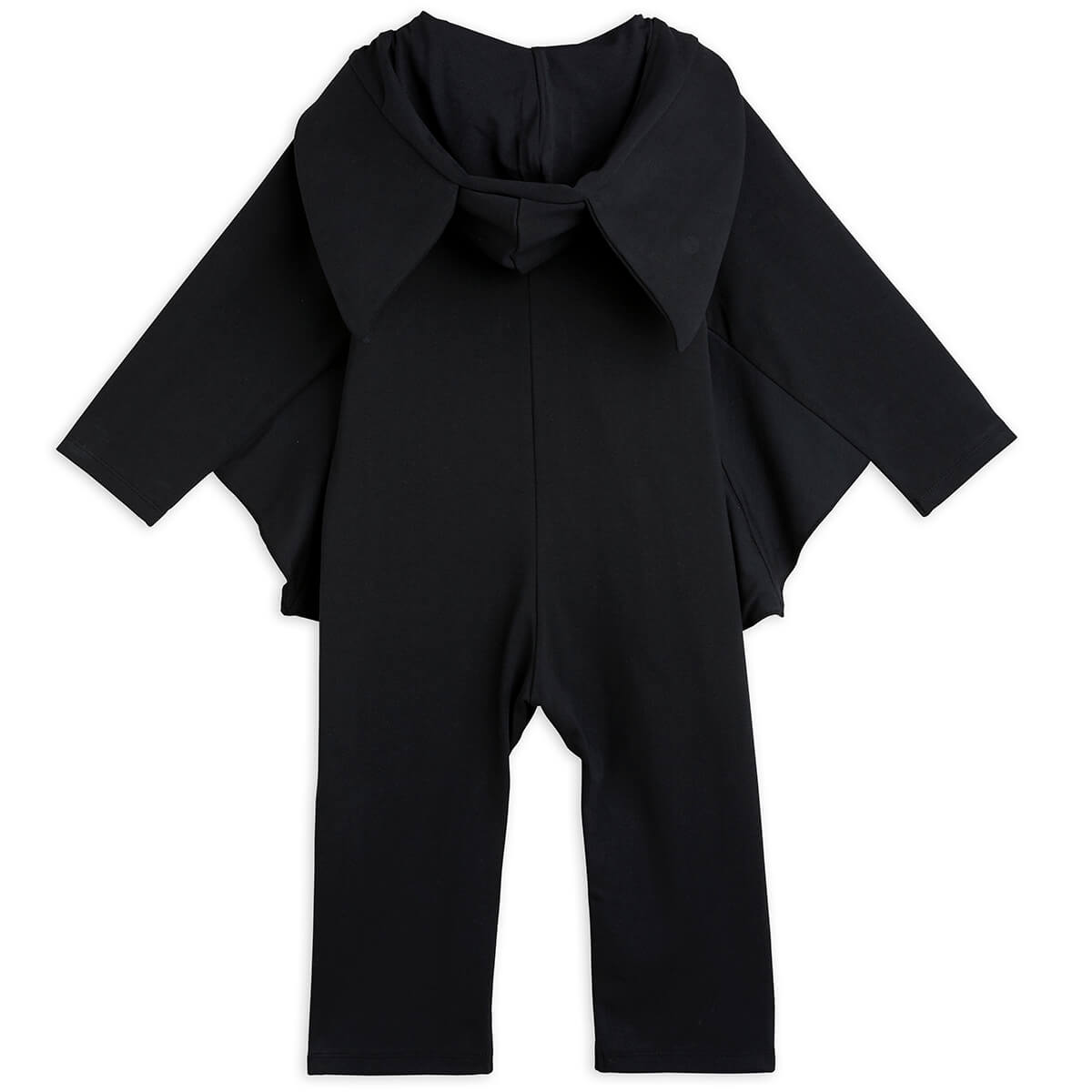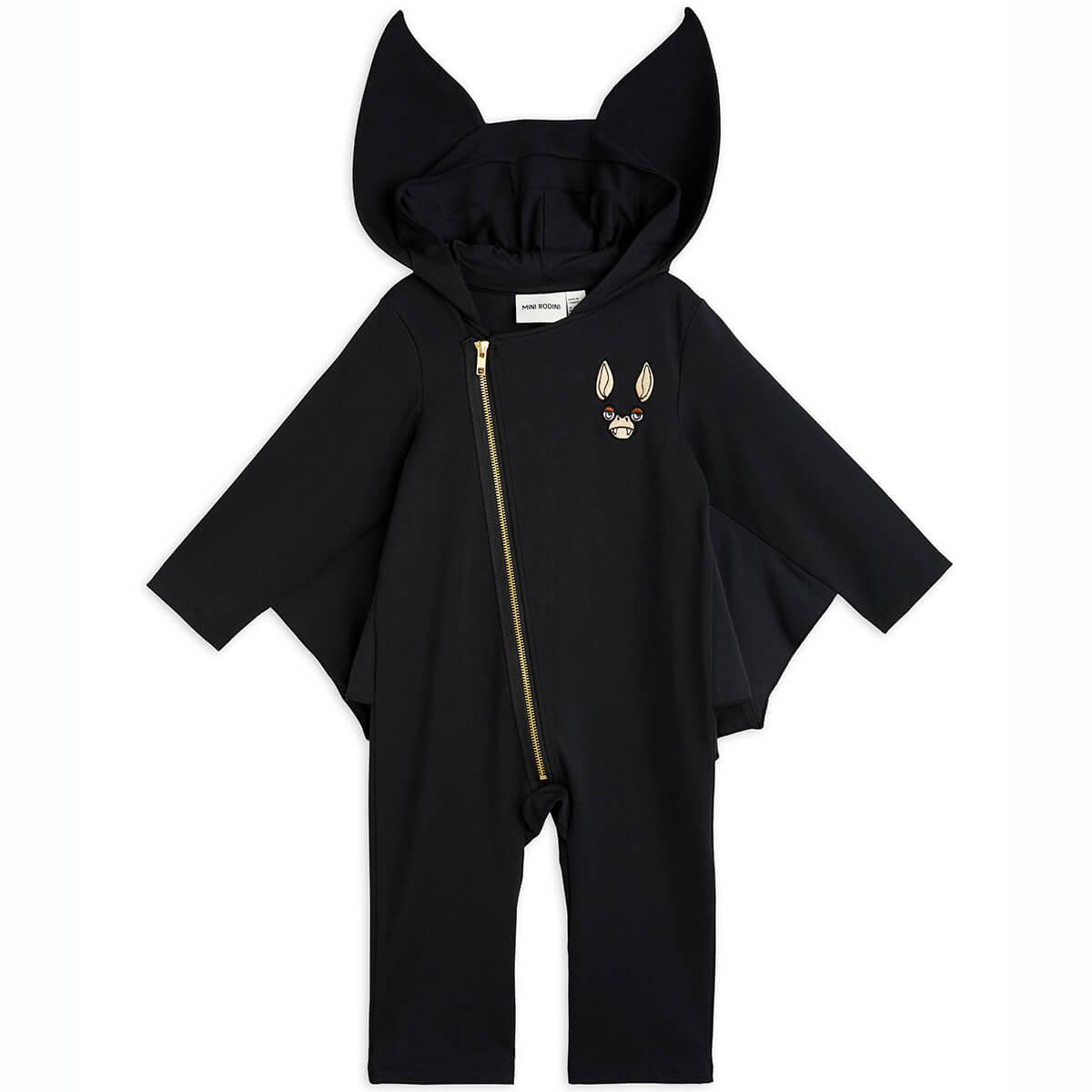 Bat Sleeve Onesie by Mini Rodini. A zip front onesie with Bat ears on the hood, embroidered bat on the chest and bat wings.