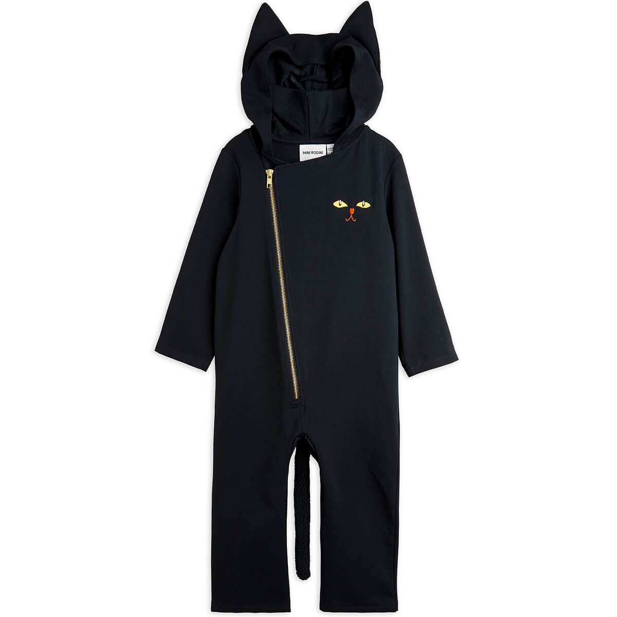 Catsuit onesie by Mini Rodini. A zip front onesie with cat ears on the hood and embroidered cat fast on the chest.