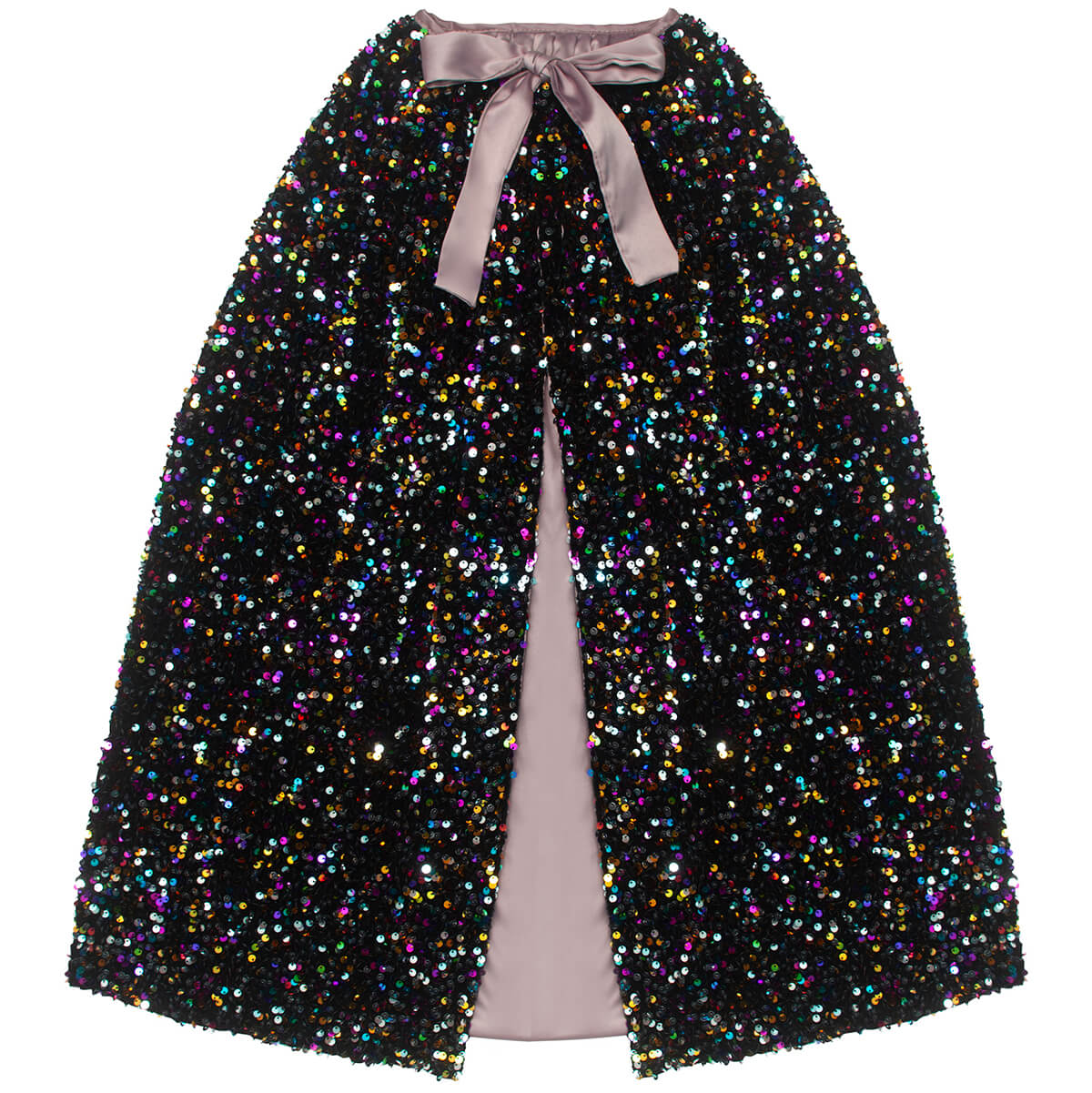 Multicoloured sequin embellished fabric cape with soft pink satin lining and ribbon bow with popper button closure.