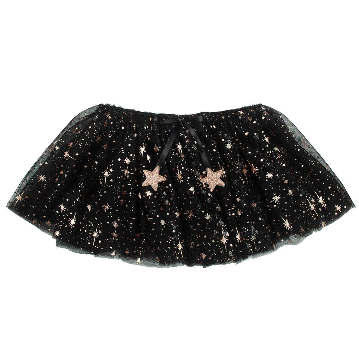 Aurora Tutu by Mimi & Lula. Cast a spell in style this spooky season with this Aurora tutu! This beautiful tutu in classic black with a spectacularly gold starry print is sure to add a fancy flair to any Halloween costume. Pair with the matching Aurora cape, hat or wand to complete the look!