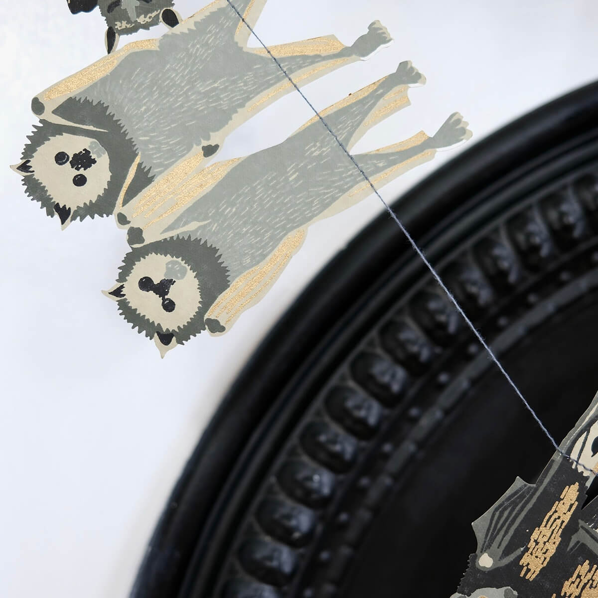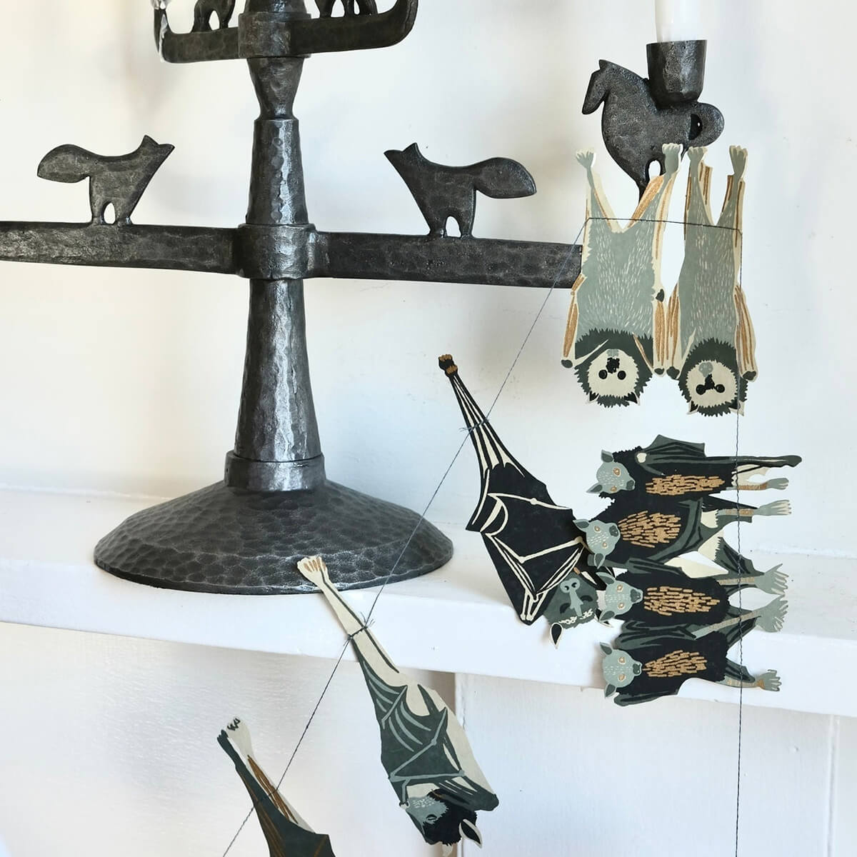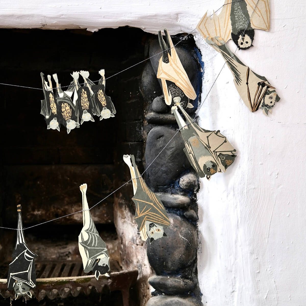 Bat paper garland by East End Press. Hand-printed three metre long paper garland featuring ten screen-printed paper spooky Halloween bats. The garland is printed on both sides on thick, handmade cotton paper. The shapes are sewn in a random order along strong cotton thread, with hanging loops on either end, meaning the garland can be hung straight away.
