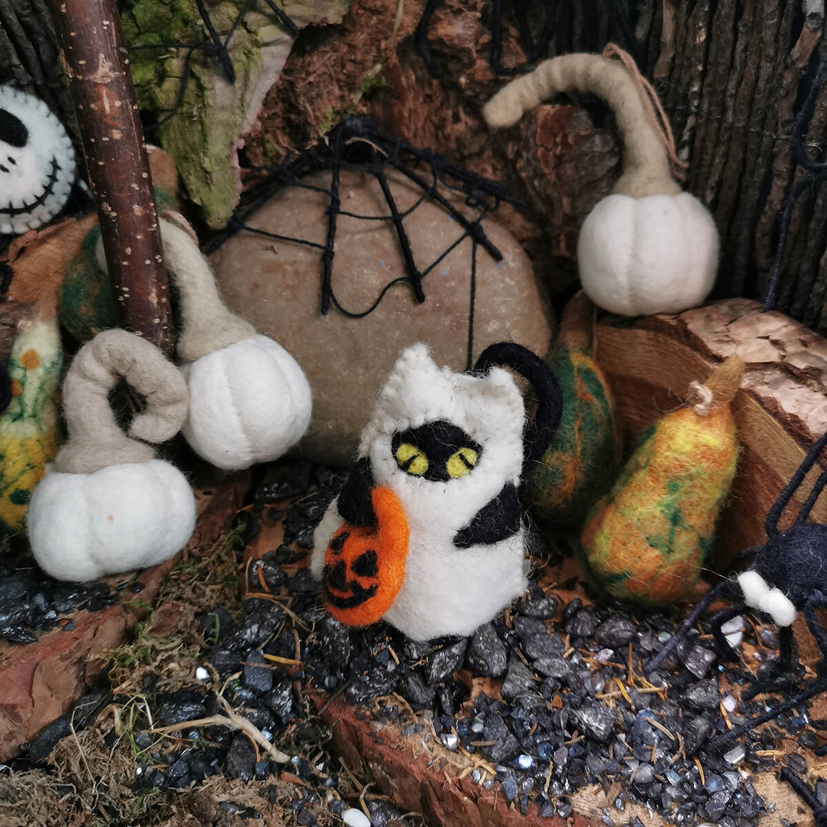 Boo Cat Ghost felted Halloween hanging decoration by Felt So Good. Hand needle felted Halloween decoration, featuring a black cat in a Halloween ghost costume which has been carefully handstitched to her body and a little pumpkin bag ready for trick-or-treating.
