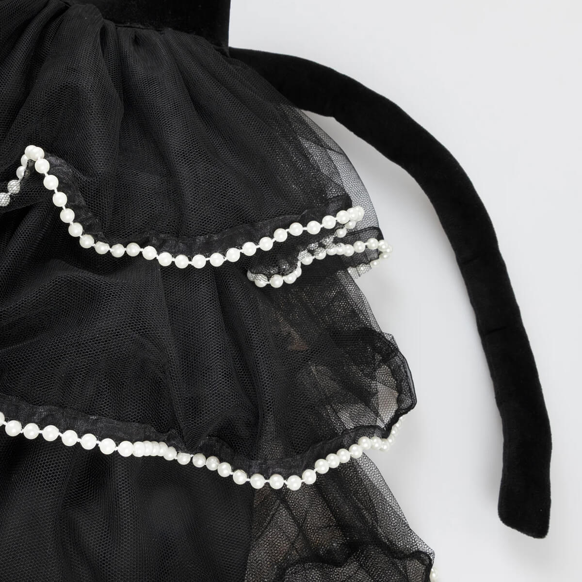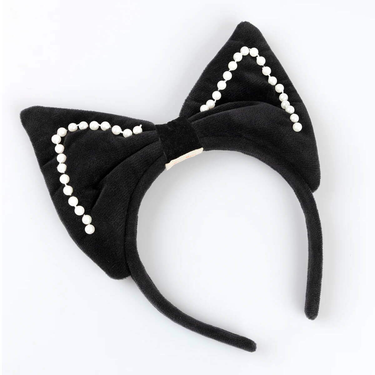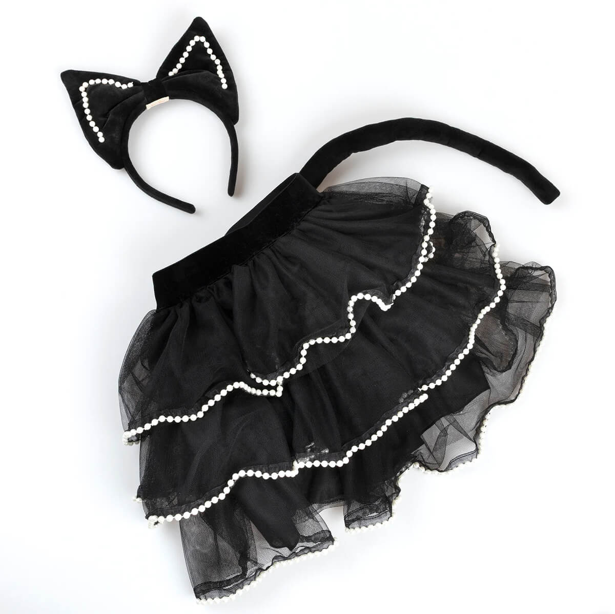 Cat Costume by Meri Meri. Miaow! There's a chic cat on the prowl! Our clever designers' attention to detail make this Halloween cat costume purr-fectly stylish! The black tulle skirt features faux pearls and a clip-off tail, so you can wear it beyond costume parties or dress-up fun. The black velvet headband, with a statement bow and faux pearl accents, is just as endearing - and also doubles as cat ears to complete the fancy feline look.