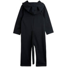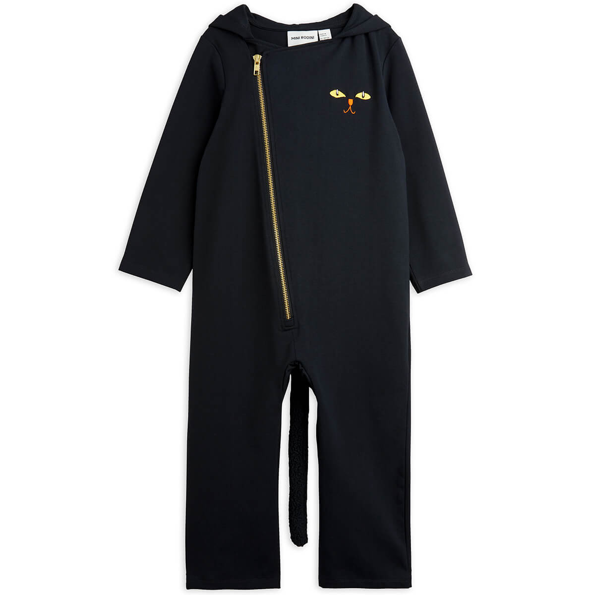 Catsuit onesie by Mini Rodini. A zip front onesie with cat ears on the hood and embroidered cat fast on the chest.