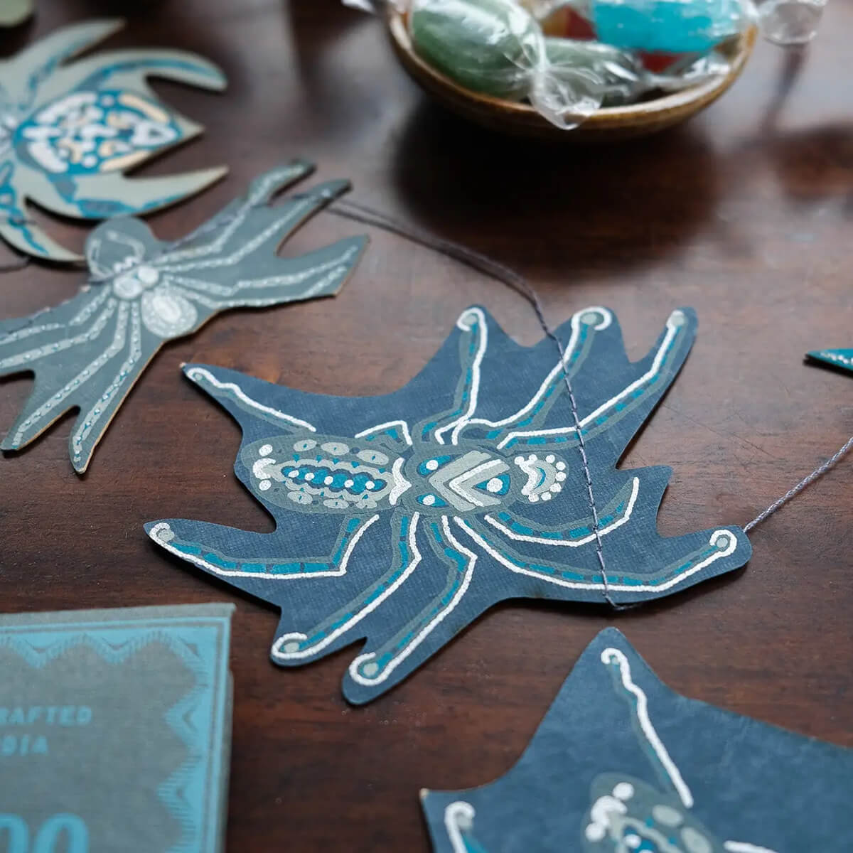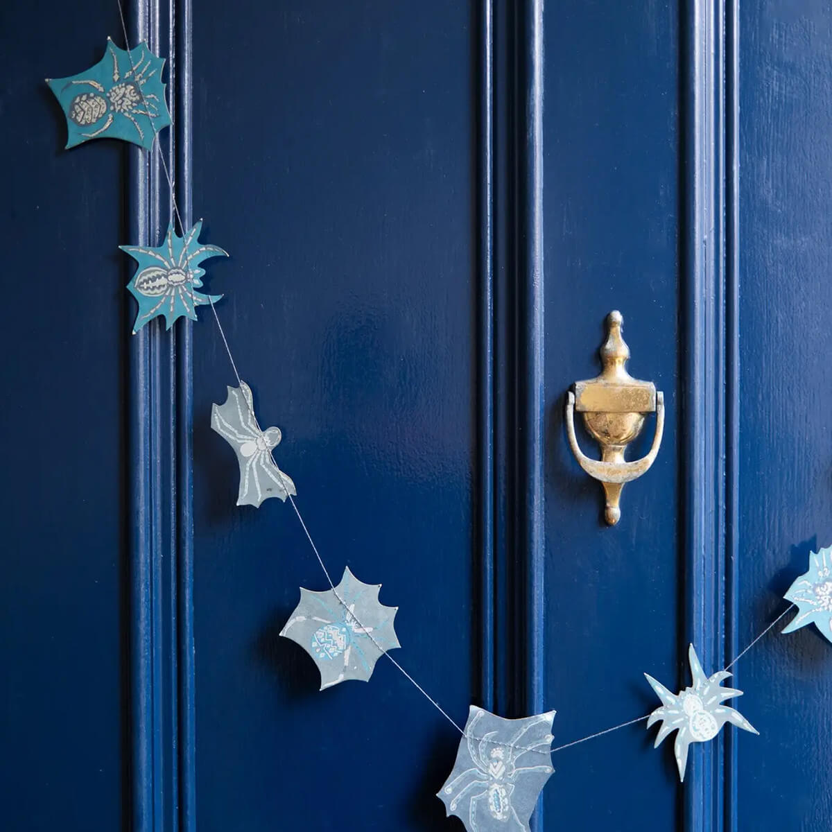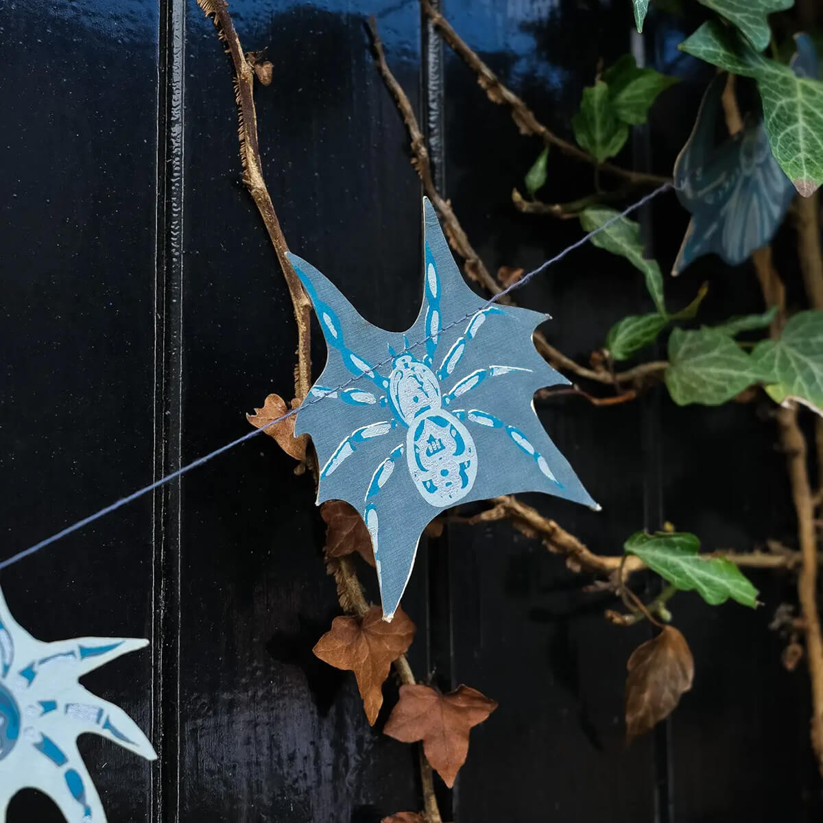 Creeping Spider Paper Garland by East End Press. Twenty crawling spiders adorn this garland perfect for some creepy Halloween fun.