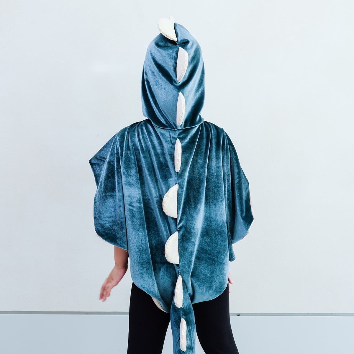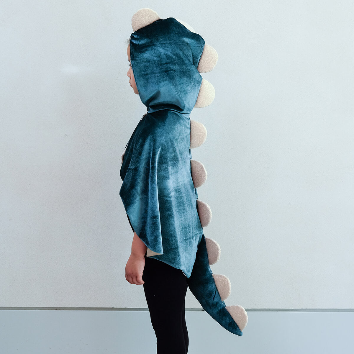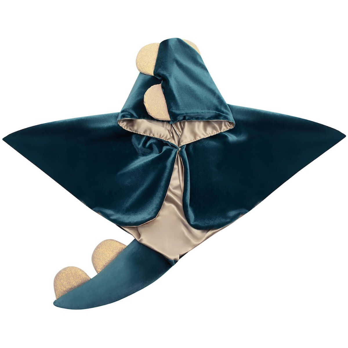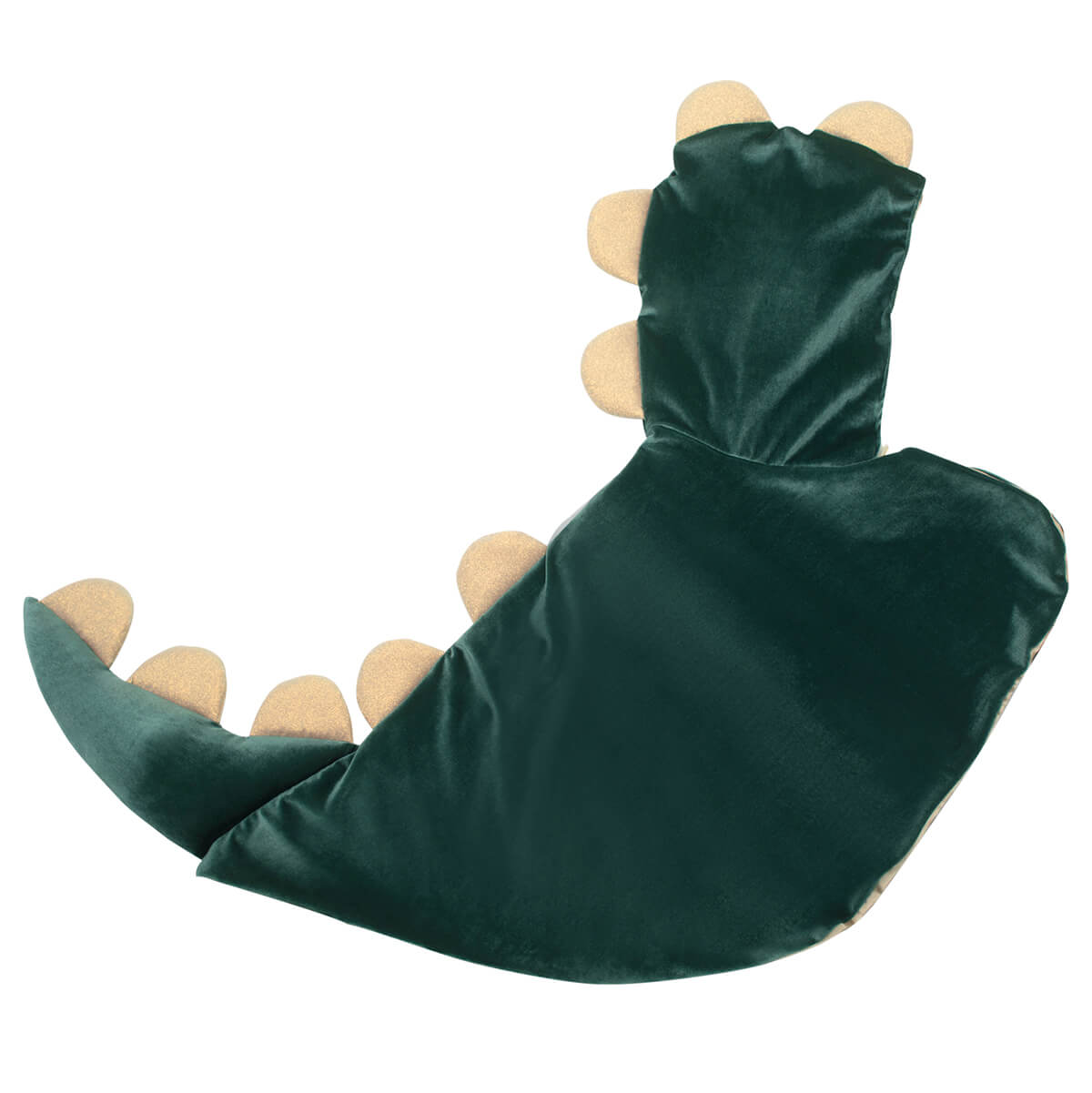 Crafted from deep green velvet fabric with gold satin lining and gold glitter scalloped 'spines' running from the hood to the tip of the tail.