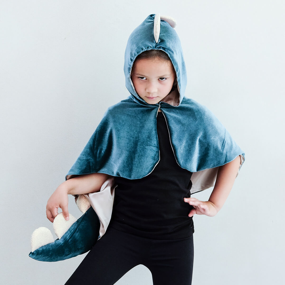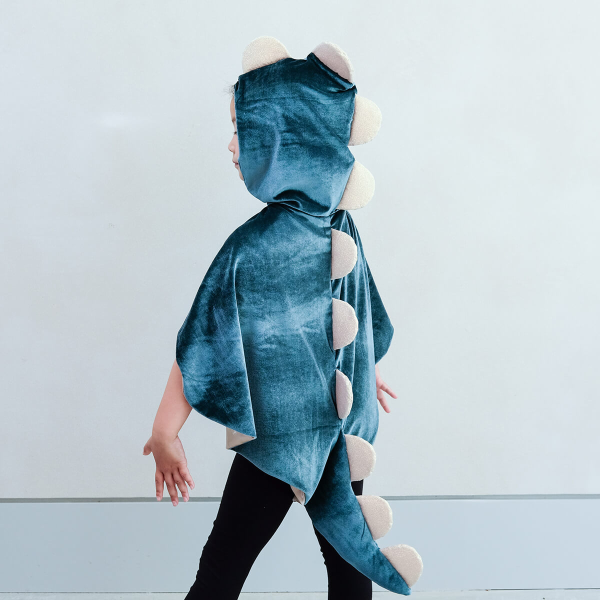 Friendly Dino Cape Dress Up by Mimi & Lula. Stomp into some prehistoric playtime fun with this super soft Friendly dino cape! Complete with hood, tail and scalloped gold glitter spines, this dino is definitely more sweet than scary.