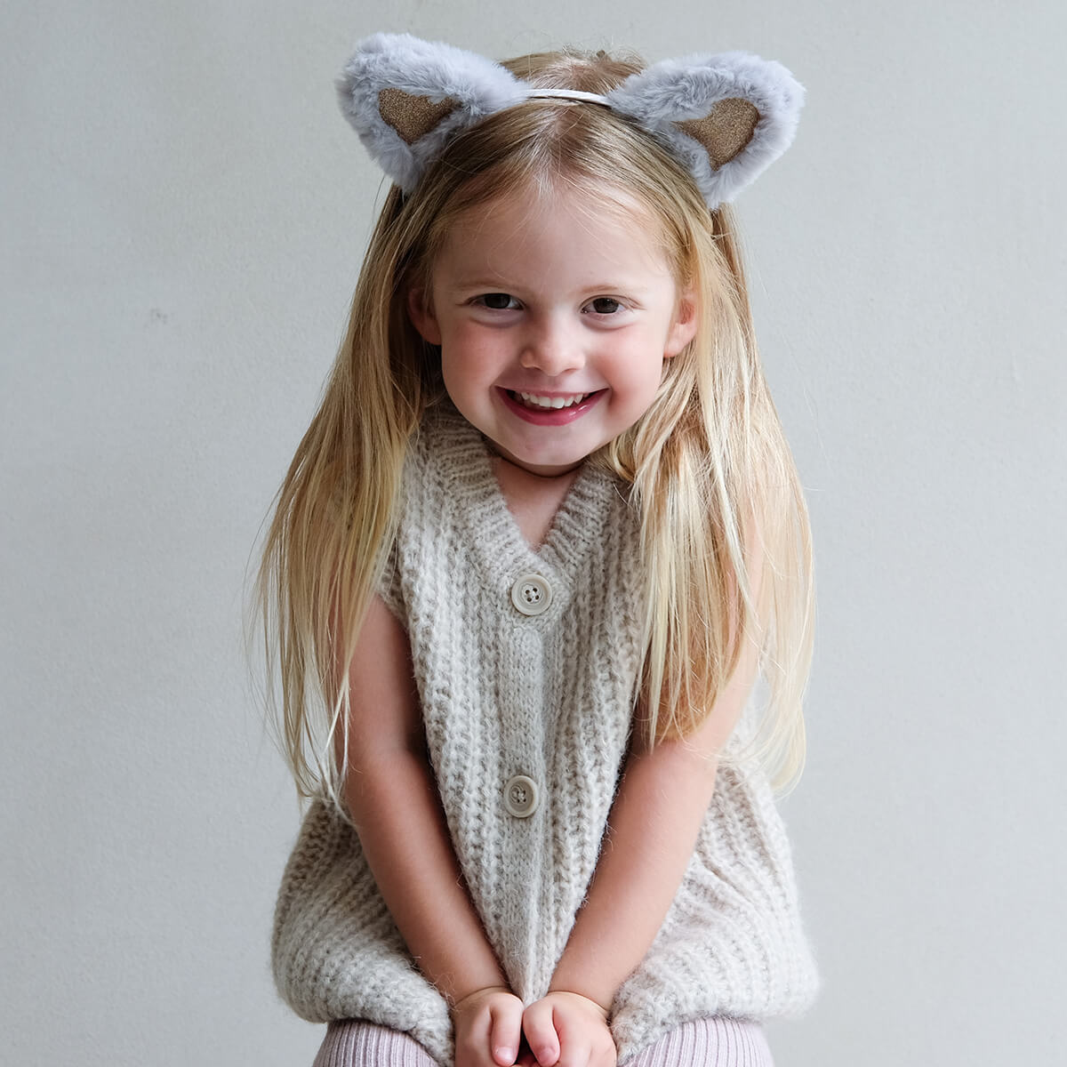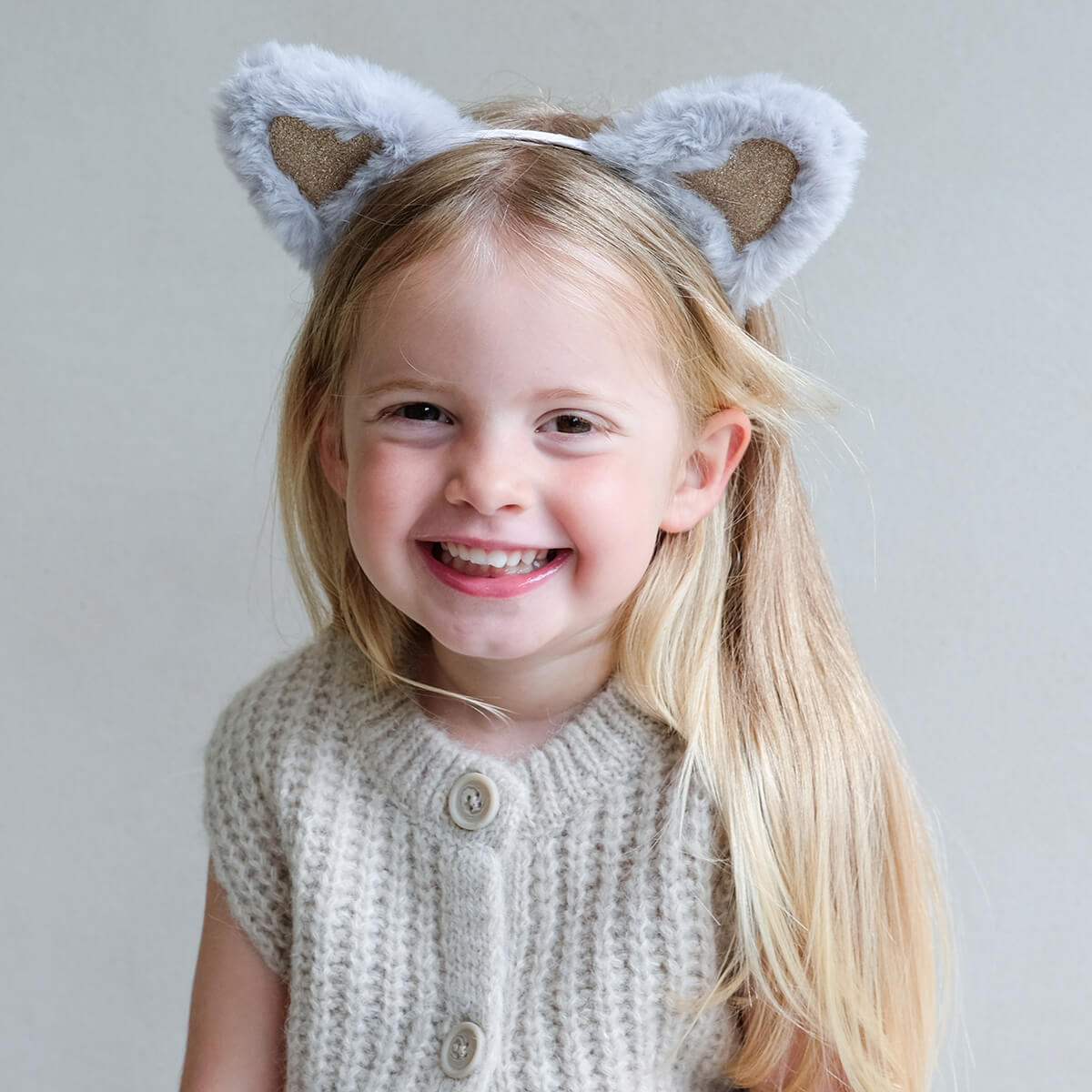 Soft grey satin ribbon wrapped alice band sized to fit ages 3-10 years. Ears crafted from fluffy grey fabric with gold glitter fabric lining.