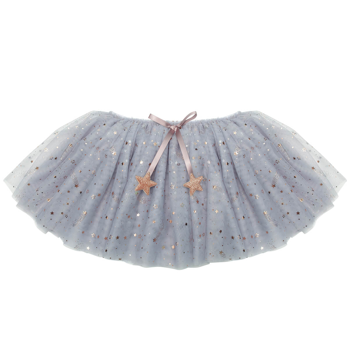 Griselda Tutu by Mimi & Lula. Be the cutest little witch this Halloween with this soft grey sparkly tutu. Layers of super soft grey tulle embellished with constellations of rose gold stars, featuring a satin bow with rose gold glitter star charms. Pair with the Griselda witches hat or cape for the ultimate halloween costume.