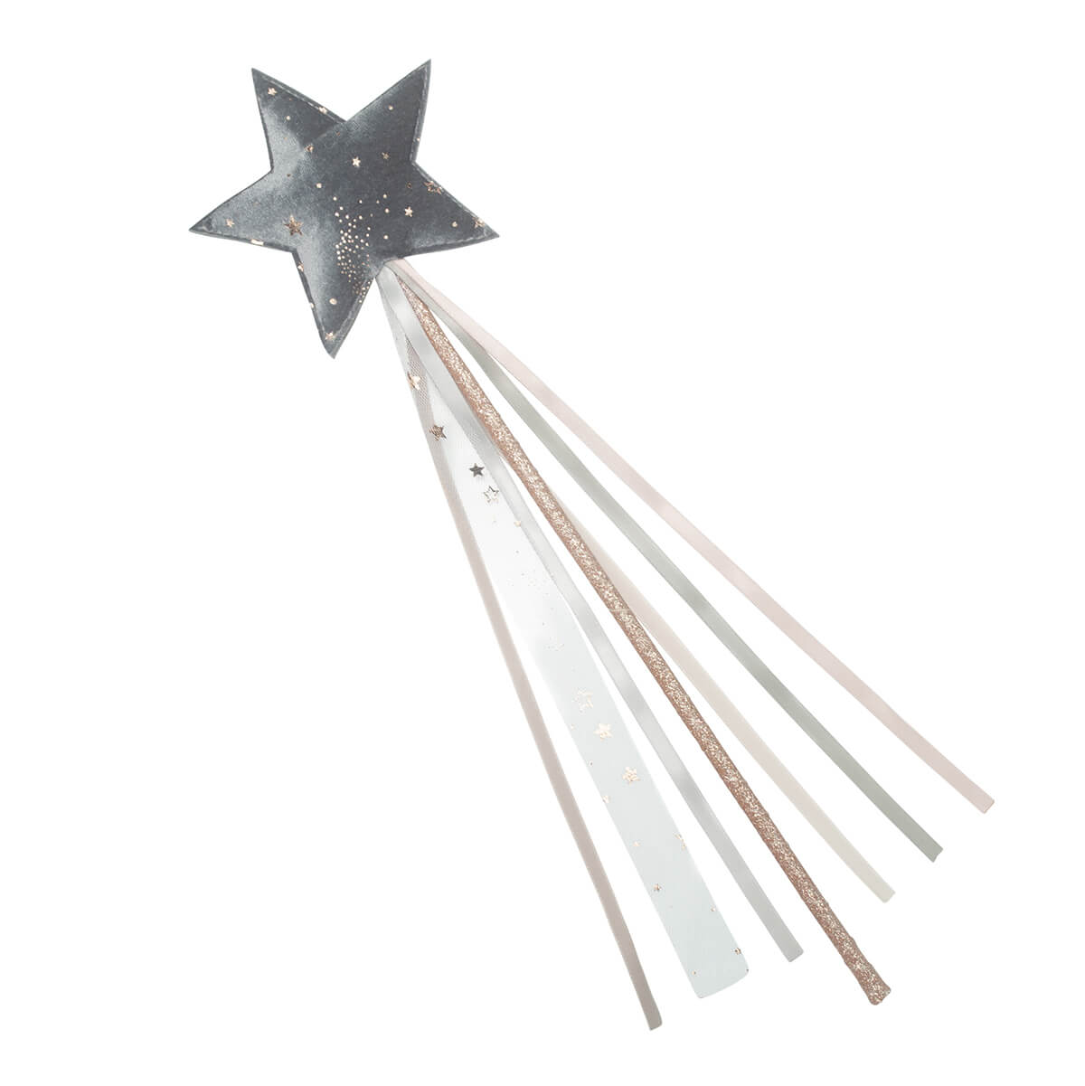 Griselda wand by Mimi & Lula. Rose gold star wand in speckled grey velvet padded star sat atop a glitter ribbon wrapped stick with satin, velvet and tulle ribbon tassels in a beautifully neutral colour palette. Perfect for little witches this Halloween. Pair with the Griselda cape, hat and tutu.