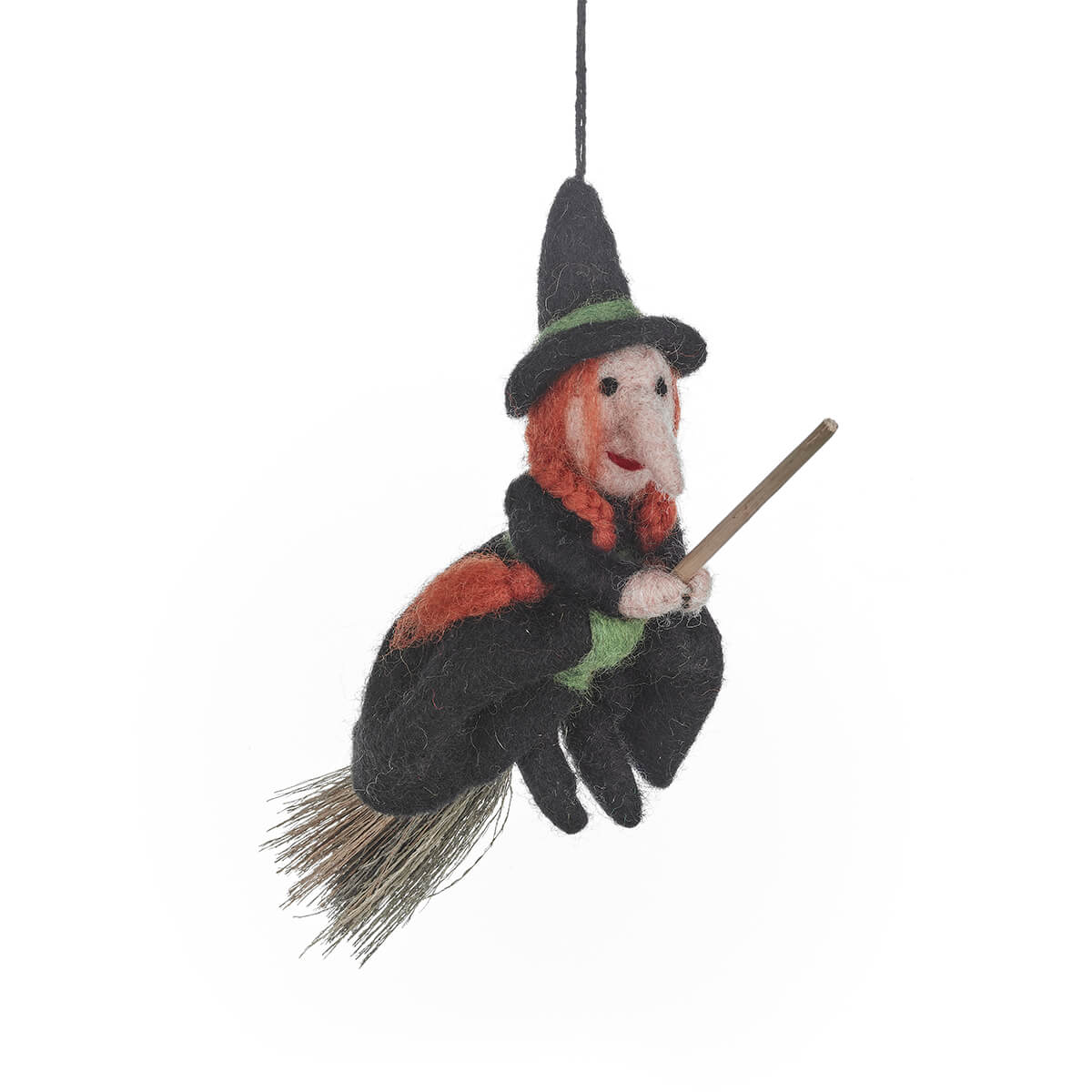 Hermione The Witch felted Halloween hanging decoration by Felt So Good. She’s one of the good witches that you will find flying around the sky this Halloween. With her gorgeously long ginger hair, witches hat and broom she zooms through the air with delight. Our artisans in Nepal cast the most powerful witches spell to bring her to life using traditional needle felting techniques with sustainably sourced material. No nasty plastic has come near Hermione and her book of spells will keep the plastic away for good!