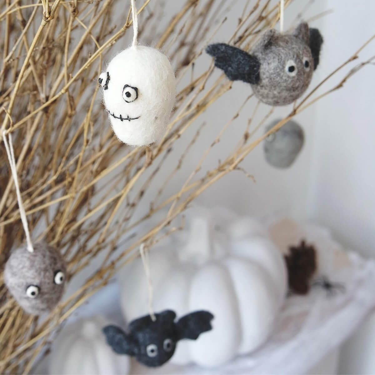 Set of three skeleton hanging Halloween decorations by Gry & Sif. Beautiful soft felted Halloween decorations with embroidered details in a Scandinavian style. Handmade and truly unique. Suitable for dangling from foraged branches in Autumn or as part of a spooky Halloween display.