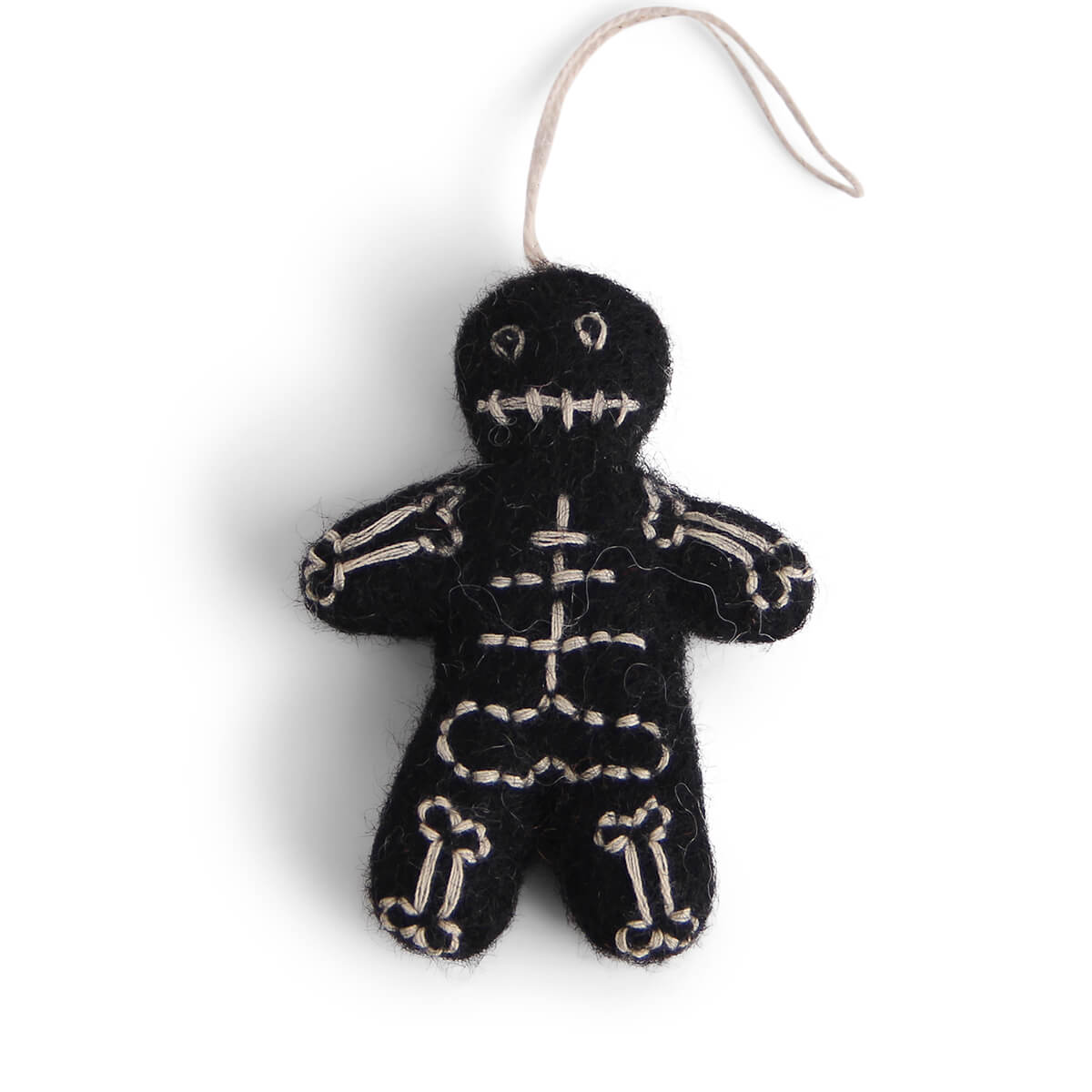 Skeleton hanging Halloween decoration by Gry & Sif. Beautiful soft felted Halloween decoration with embroidered details in a Scandinavian style. Handmade and truly unique. Suitable for dangling from foraged branches in Autumn or as part of a spooky Halloween display.