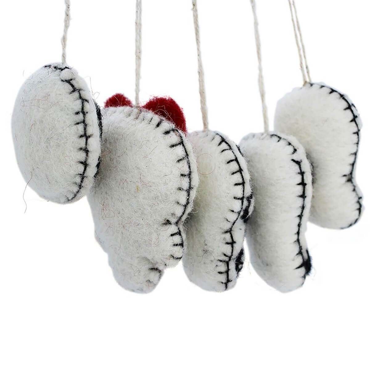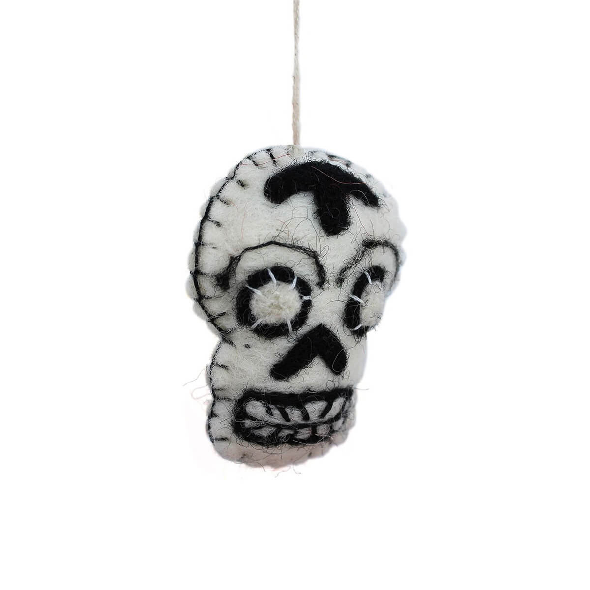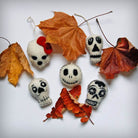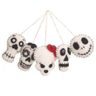 Skulls felted Halloween hanging decorations by Felt So Good. Hand needle felted Halloween decorations, featuring five different skull decorations with embroidered details, inspired by Día de los Muertos (Day Of The Dead).